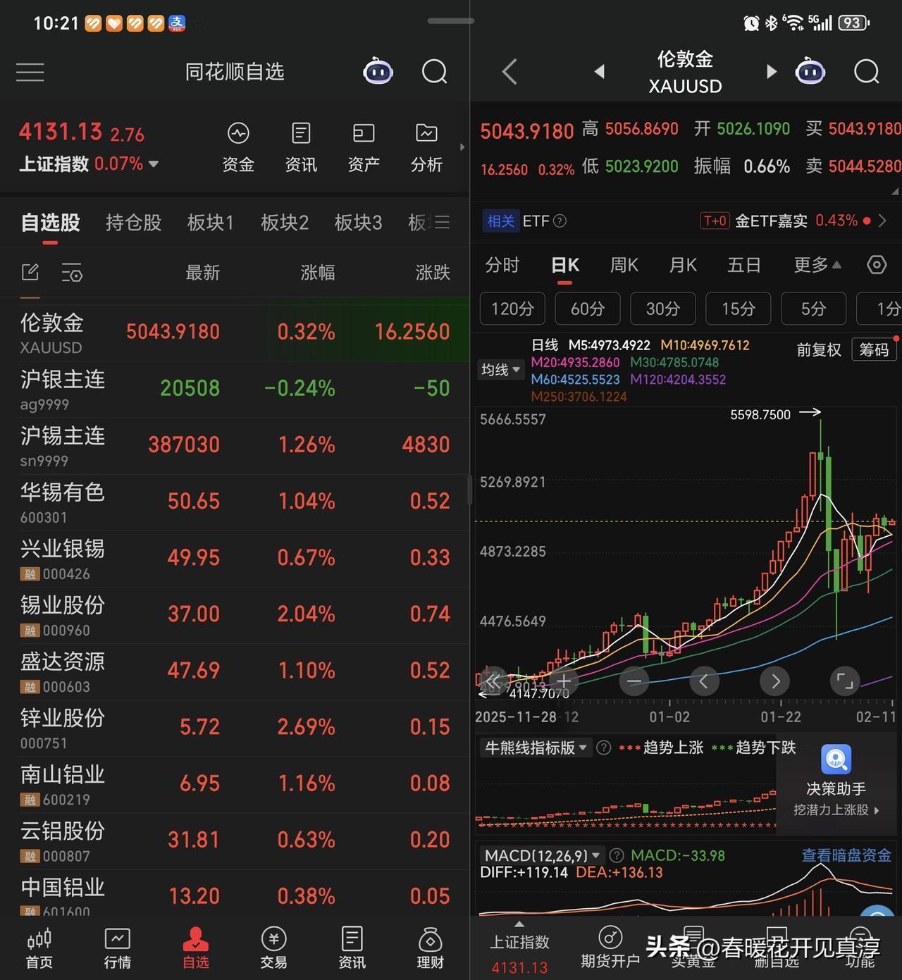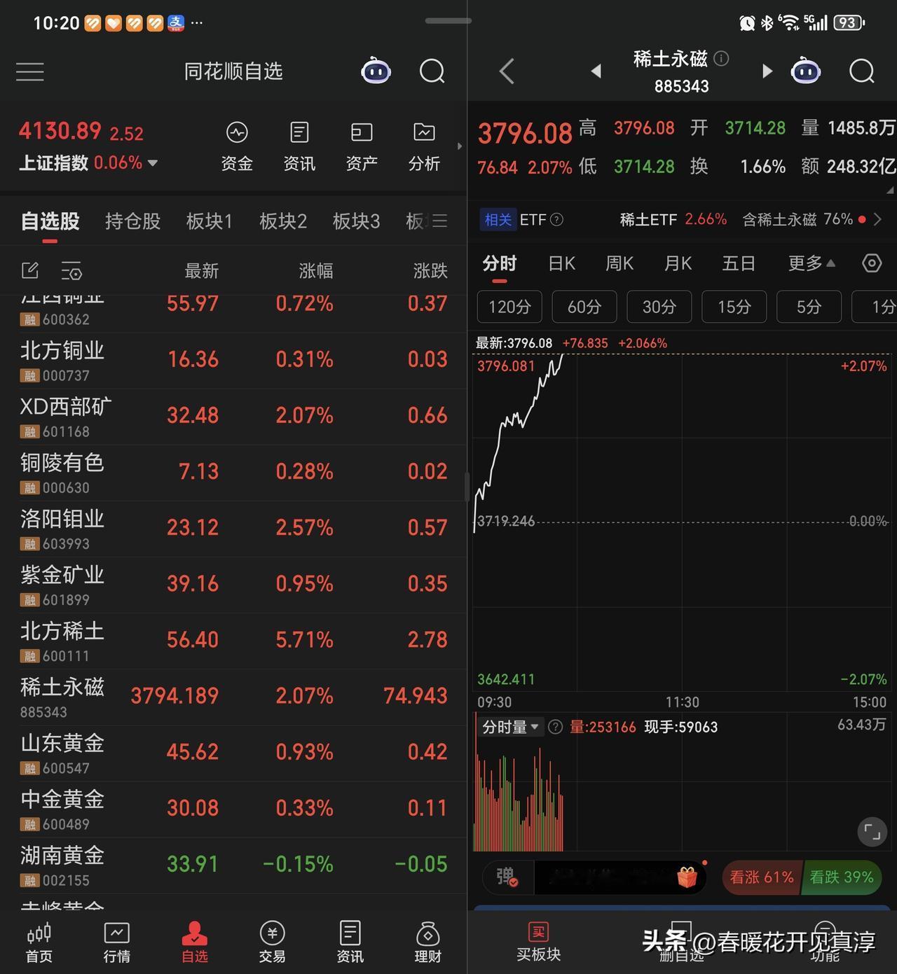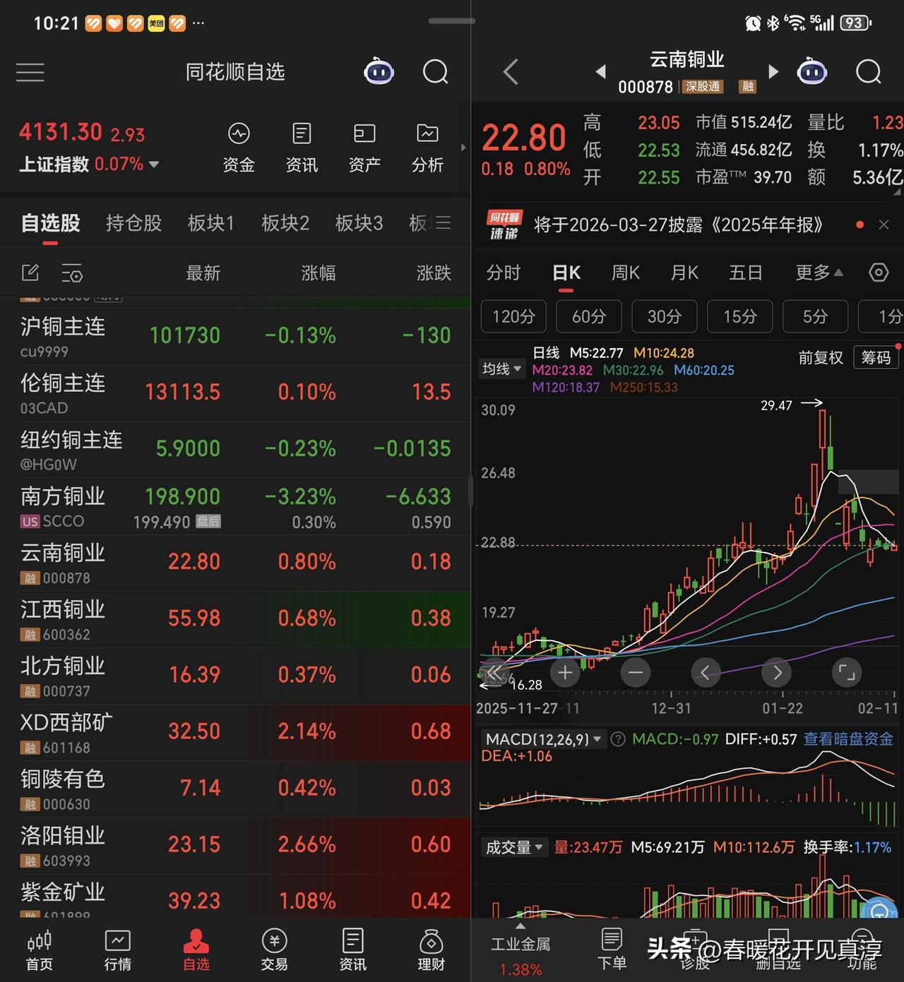 今天稀土股在有色板块里面属于异军突起,北方稀土和厦门钨业涨的都不错,但是稀土之前已经涨了一大波,现在属于之前调整时间比较长,相对来说,调整压力小一些的细分板块。 黄金白银铜铝包括和锡有关的品种,今天也都红盘,这是前一段时间的暴跌,已经基本完成释放,现在就是在逐步的修复,修复之后再看哪些板块还是要继续向上,哪些就在这里做一个头部。 在这么短的时间里,我不认为稀土就已经完成了对估值的消化,所以在北方稀土2000亿市值之后,我就放弃了这个品种。 最近和铜有关的信息出来的比较多,包括库存情况,包括铜的提炼技术等等。总的来说,铜是未来的焦点之一,这中间会有各种各样的信息出来冲击我们的认知。反正我就抓住一条,同是算力金属,铜的大周期远没有结束。 所以,云南铜业也好,江西铜业也好,我不认为他们在这里就是顶部,最多算是一个中期平台,江西铜业最起码要限高,云南铜业最起码要回到千亿市值,这是我对他们的预期。