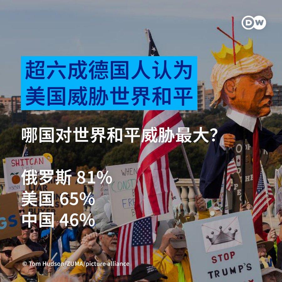 德国人自己做的调查,挺有意思的。 超过六成德国人认为美国威胁世界和平