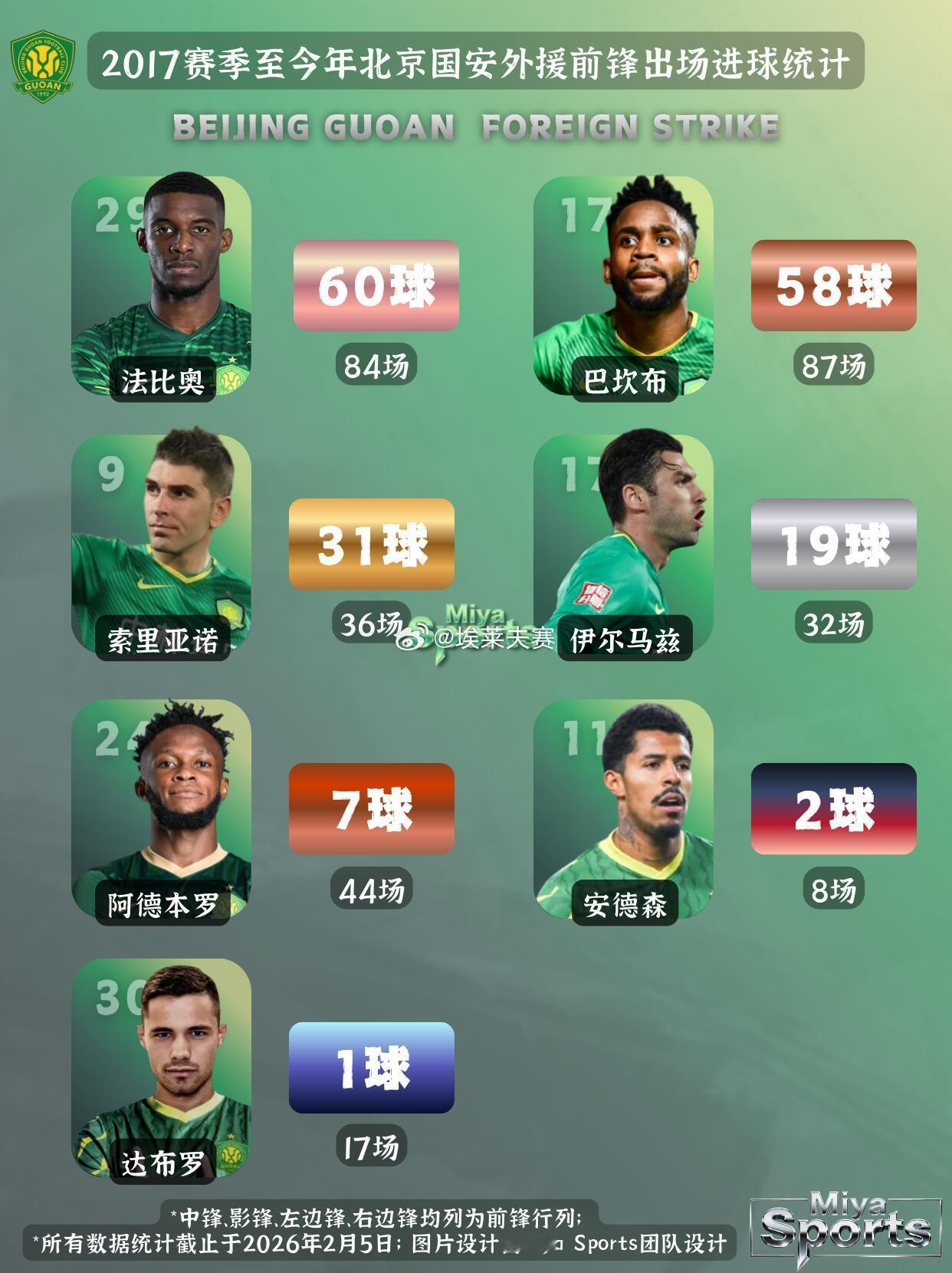 从2017到2026,国安锋线换了一波又一波外援,有人进球爆棚,有人高开低走。今天我们就来盘点一下🧐。🔥- 法比奥:84场60球,场均0.71球,国安队史外援射手王,稳定输出的代名词。
