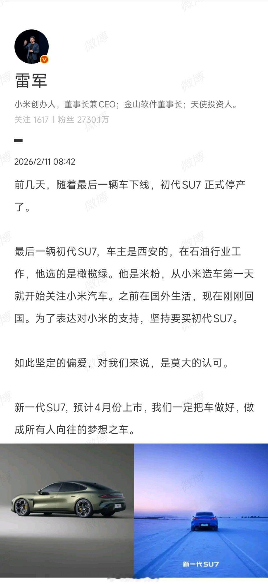 初代小米SU7正式收官,最后一位车主是西安米粉,这份支持真的很暖心。新一代SU7也将在4月上市,期待小米继续打磨产品,不辜负大家的信任与期待。