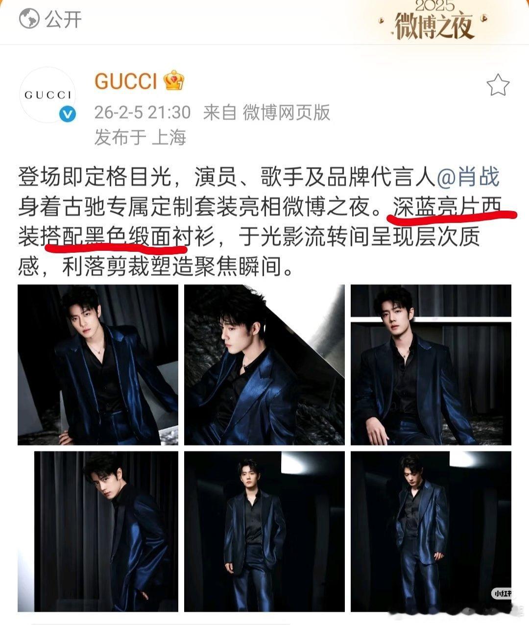 肖战 Gucci专属定制肖战微博之夜第二身造型是真的帅气, 这身量身定制的面料不是丝绸,是亮片!是由一个个小鳞片缝起来的特别重工,所以大家看起来才会觉得流光溢彩像水波在流动!其实当天老古就发博说了亮片西装只是大家都看脸忽略了文字!肖战 gucci专属定制