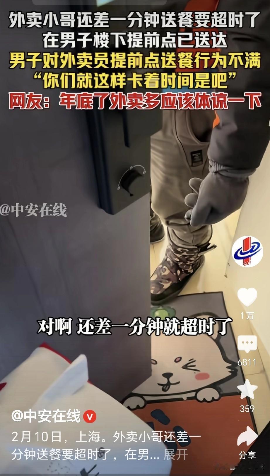 上海,一男子点外卖,骑手接单后迅速送单,可到楼下,眼看时间到了,骑手怕超时罚款,提前1分钟点了送达,随后骑手将餐送到男子手中,男子急了: 你刚送达是吧?你在楼下就点送达了,你就这样卡着时间是吧?男子发布视频,想要大家评说一下,万万没有想到,评论区一边倒了! 一男子有些饿了,他点了份外卖,点完之后他就开启了焦急的等待。 他看着订单,显示商家正在出餐,不大一会,就显示骑手已经取餐。 他稍等了一会,忍不住又点开订单,眼看骑手又近了一些,男子欣慰,期盼能早点听到骑手的敲门。 殊不知这时,骑手小哥早就跑的气喘吁吁,他一路飞驰,在大街小巷里迅速的穿过。 他跑外卖已经很久的时间,这里路径他早就烂熟于心,他取餐送餐一气呵成,风里雨里早就锻炼成了钢筋铁骨。 男子点的餐他接到之后,他第一时间就往目的地赶去,可路上行人匆匆,车多人多,他不得不凭借着高超的车技在缝隙里穿梭。 到了小区,他放好车辆,他脚底生风,跑的像车轮一样,他眼看到了楼下,急匆匆往电梯奔去,可等电梯,又成了一种煎熬。 订单的时间在飞速的流逝,眼瞅着就剩一分钟了。 万一要是超时,不仅这单白跑,还得会被平台扣钱,甚至可能会收到差评。 一旦收到差评,信誉就会降低,自然而然就会影响后面的接单。 情急之下,小哥在楼下就点了已送达按钮,之后他提着外卖袋子,冲进电梯,按下了楼层。 他心里还在琢磨,一会怎么跟顾客解释,可是他又略劝了自己,不要这么担心。 因为他经常会遇到过这样的情况,因为送单时总有一些自己控制不了的情况。 也许会遇到红灯,也许会遇到过堵车,遇到天气不好,有时还会因为赶时间摔上一跤。 每当这时,他就更加的焦急,几次超时后被扣钱,路上所有的努力就化为了乌有。 既然已经这样,那就听天由命,如果顾客非要责怪,他也没有办法,毕竟确实是已经晚了。 电梯到了所选的楼层,他核对好房号,鼓起勇气敲响了门。 男子在家里等餐,早就等的饥肠辘辘,他一开门,骑手举着外卖赶忙递到他的手中。 男子质问小哥,你们就这样看着时间是吧? 小哥沉默片刻,只有回答了个“额”字,他没解释,因为已经点了,确实是他不对,认打认罚就好了,因为还有下一单在等他。 男子嘴里说道,行,我知道了,其实心里还是有些不满。 我点的餐明明平台有时间显示,你没在规定时间送到,竟然还提前一分钟按了已送达按钮。 你既不提前给我打电话告知,送到连个道歉话都没有一句,我很生气,要大家给评一评礼。 男子把视频发布出来,希望大家来评判这一件事情。 可是他没想到,网友却又一边倒了。 有人说到,何必出这咄咄逼人的口气?就1分钟而已,临近过年路上人多车挤,人还是多一点宽容和善良吧。 有网友表示,我曾经有一个外卖迟到一个多小时,来的时候连句道歉也没有,我也没有催他,怕他不安全,也懒得给他差评。 那么好奇的问一句,大家点外卖,会时不时盯着送餐时间吗? 我一般点完了,就不管了,就等来电话,或者敲门,也没注意是否超时,目前无一个差评,也不怎么点评。 有位外卖员说到,不是外卖员卡着时间送,是平台算法算下来,他手上的单子时间就是一分钟挨着一分钟,我是跑外卖的,我懂这个。 看来,更多的人选则的是善良和体谅,他们并不在乎是否晚了这一分钟,外卖员送单很不容易,他们也有父母孩子,也有家人在背后等他。 对外送员来说,超一分钟就要被罚款或者投诉,对点餐人来说,超时一分钟没什么严重的损失,谅解并理解一下努力工作的不易,善出才会福来的! 对此,你怎么看?