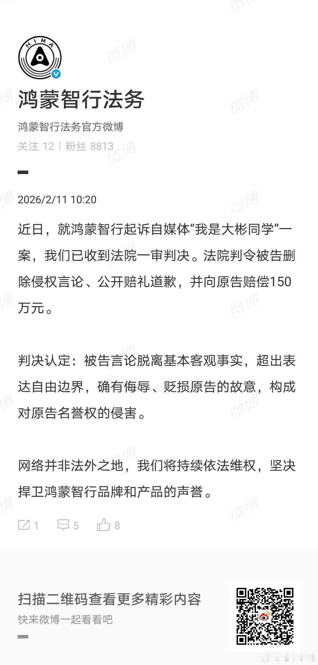 注意哦,一审判的是名誉权侵害,足以说明大彬的当时的言论有多离谱了。