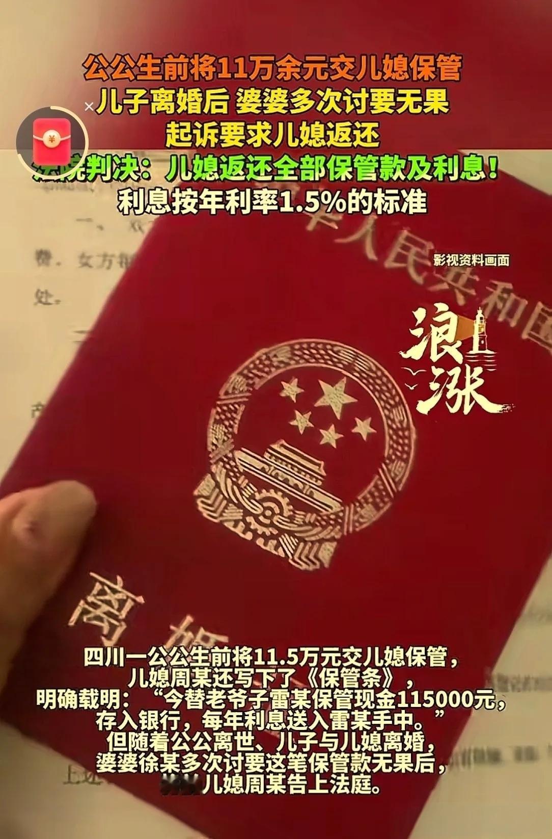 “白嫖”婆婆11.5万血汗钱,儿媳甩出一句话激怒全网!法院判决让网友直呼解气 四川攀枝花最近发生了一起让人既愤怒又唏嘘的案子。 事情要从7年前说起。2017年,一位姓雷的老大爷把毕生积蓄11.5万元现金,郑重地交到了儿媳妇周某手里。 老人之所以这么做,是因为完全信任自家人。周某当场写下一张《保管条》,白纸黑字写得明明白白:“今替老爷子雷某保管现金11.5万元,存入银行,每年利息送入雷某手中。” 从那以后,周某每年确实都会把利息送到公公婆婆手上,老两口拿着这些钱当零花钱,日子过得平静而满足。 可谁也没想到,一场变故正在悄然逼近。 2020年6月,雷大爷突然离世。老人一走,家庭关系开始发生微妙的变化。周某不再像以前那样按时支付利息给婆婆徐阿姨,对那11.5万元本金更是绝口不提。 徐阿姨心里虽然犯嘀咕,但想着毕竟还是一家人,儿媳可能有自己的难处,也就没好意思主动开口。 这一拖,就拖到了2024年7月。 这一年,周某和徐阿姨的儿子小雷感情破裂,两人在民政部门办理了离婚手续。昔日的婆媳,如今成了陌路人。 办完离婚手续后,徐阿姨终于坐不住了。她找到周某,客客气气地说:“你和雷某都离婚了,那他爸生前交给你保管的那笔钱,也该还给我了吧?” 没想到,周某的态度让徐阿姨心寒。她要么支支吾吾,要么找各种理由推脱,反正就是不提还钱的事。 更让徐阿姨气不过的是,周某后来干脆摊牌了:“这笔钱都保管8年多了,按照法律规定,诉讼时效只有3年,早就过期了,我一分钱都不用还!” 这话传到徐阿姨耳朵里,老人家差点气晕过去。自己和老伴省吃俭用攒下的血汗钱,怎么就“不用还”了? “我凭什么不能要回这笔钱?”在律师的帮助下,徐阿姨把周某告上法庭。她的诉求很明确:不仅要拿回11.5万元本金,还要周某支付这些年来的利息,总计15万余元。 法庭上,双方展开了激烈的交锋。 徐阿姨拿出那张泛黄的《保管条》,声音颤抖地说:“白纸黑字写得清清楚楚,她替我丈夫保管这笔钱。现在我丈夫不在了,她作为保管人,理应把钱还给我们。” 周某则表现得理直气壮。她向法庭出示了一页自己手写的记录,上面写着:“2018年带雷某旅游,花费4082元从保管款中扣除”“2018年9月雷某取走2万元”等内容。 “这11.5万元本来就是雷某交给我保管的借款,我们早就约定好可以用于家庭开支。”周某振振有词,“雷某生前说过,等他不在了,剩下的钱就留给他孙女上学用。” 但徐阿姨当庭指出,这份记录完全是周某单方面书写的,上面既没有雷大爷的签字,也没有任何其他证据佐证。 “空口无凭!”徐阿姨情绪激动,“她说钱花了就花了?她说我老伴同意就同意了?证据呢?” 经过审理,法院认为这起案件属于保管合同纠纷。周某出具的《保管条》合法有效,双方应当按照约定履行义务。 对于周某提出的“诉讼时效已过”的抗辩,法院明确指出:《保管条》并没有约定保管期限,因此诉讼时效应当从权利人主张权利时起算,周某的说法不能成立。 至于周某提交的那份手写记录,由于是她单方面制作,没有雷大爷的签字确认,也没有其他证据相互印证,法院不予采信。周某辩称雷大爷生前已部分支取款项、剩余款项应用于孙女学习生活等说法,同样因证据不足不被采纳。 法院还查明,雷大爷去世后,他的合法继承人除了妻子徐阿姨外,还有儿子雷某堂和女儿徐某英。雷某堂和徐某英均书面表示,自愿放弃对这笔保管款及利息的继承权,全部权益由母亲徐阿姨一人享有。 最终,法院作出判决:周某必须在判决生效后十日内,向徐阿姨返还11.5万元保管款。同时,以未付款项为基数,按照年利率1.5%的标准,支付自2017年1月1日起至款项付清之日止的利息。 这个判决让很多关注此案的网友直呼“解气”。一位网友留言说:“法律终究是公正的!想钻空子赖账的人,最终还是没能得逞。” 《民法典》第900条明确规定:“保管期限届满或者寄存人提前领取保管物的,保管人应当将原物及其孳息归还寄存人。”在这起案件中,周某作为保管人,在保管目的已经无法实现的情况下,理应返还保管款及利息。 这起案件也给我们提了个醒:即使是亲人之间,涉及大额钱财往来时,最好也要签订规范的书面协议。如果周某当初真的从保管款中支取了部分钱款,只要她能拿出雷大爷签字确认的凭证,或者在取款时有其他人在场见证,情况可能就会完全不同。 值得思考的是,在这起纠纷发生前,周某和徐阿姨一家关系融洽,她每年按时支付利息,表现得完全像个孝顺儿媳。是什么让她在公公去世后,选择用如此决绝的方式对待年迈的婆婆?是金钱的诱惑,还是离婚后心态的变化? 目前,周某尚未就是否上诉作出表态。而对徐阿姨来说,这场官司虽然赢了,但她失去的,恐怕远不止这些年的利息那么简单。 (案例来源:四川省攀枝花市东区人民法院民事判决书)