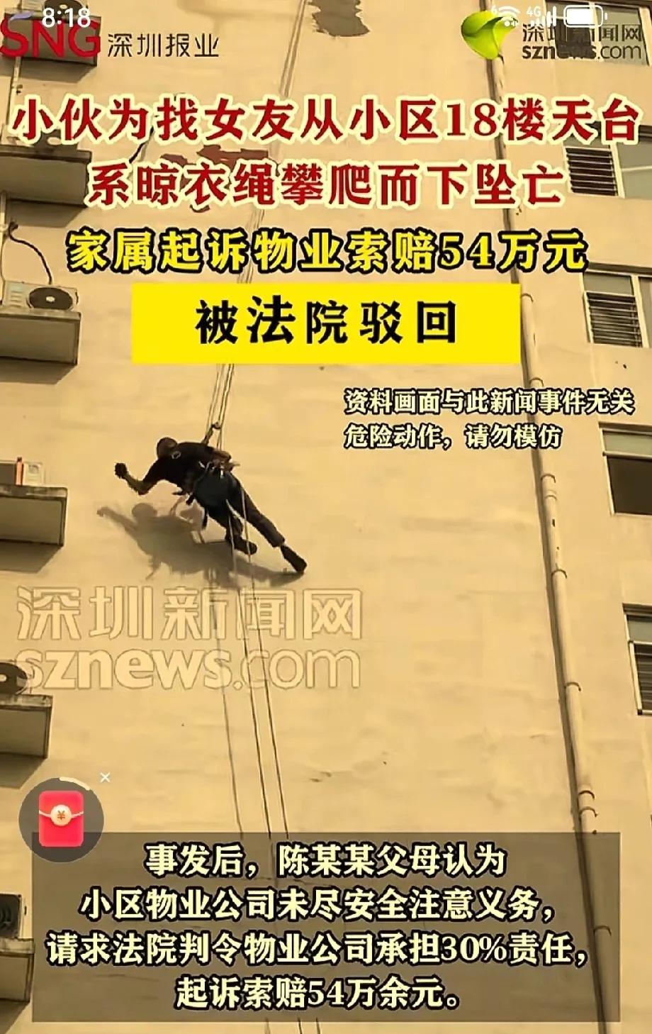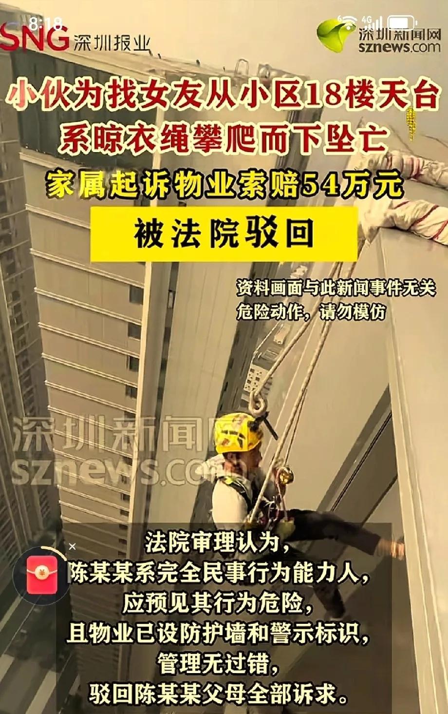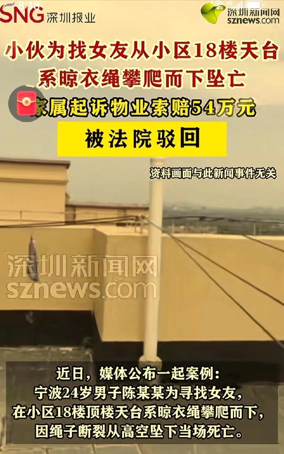 凌晨的攀爬:一根晾衣绳,一场天人永隔的审判 浙江宁波,凌晨四点的街道空无一人。24岁的陈某某看了一眼始终没有回复消息的手机屏幕,一脚油门,车子朝着女友居住的小区疾驰而去。他心中只有一个念头:必须立刻见到她。这个执念像野草般疯长,吞噬了他所有的理智。 车子悄无声息地滑入老旧小区。陈某某没有像往常那样抬头望向15楼那扇熟悉的窗户,而是径直走进单元门,按下了电梯的最高楼层按钮。电梯缓缓上升,金属箱体在寂静中发出轻微的嗡鸣。18层,顶楼到了。 推开那扇厚重的防火门,凌晨的冷风瞬间灌满了他的衬衫。天台上散落着被遗弃的旧家具、生锈的晾衣架,还有几根缠绕在一起的尼龙绳。陈某某的目光落在了一根淡蓝色的晾衣绳上——那是楼下阿姨们常用来晾晒床单的普通绳子。他弯腰捡起,双手用力扯了扯,尼龙绳发出“嘣嘣”的闷响。 接下来的七分钟,成了他生命中最后的清醒时刻。 他将绳子一端系在天台通风管道的铸铁接口上,用力打了两个死结。另一端,他在自己腰间绕了三圈,同样系得紧紧的。整个过程,他没有丝毫犹豫,仿佛不是在准备一场赌上性命的危险行为,而只是在完成一件寻常小事。翻越那道1.25米高的防护墙时,他的动作甚至带着一种决绝的流畅。 墙外的世界漆黑一片。陈某某用脚试探着找到了外墙的排水管,然后,他松开了抓住墙沿的双手。 绳子瞬间绷直,发出令人牙酸的“吱呀”声。 他的身体在空中晃动,试图用腿夹紧湿滑的塑料管道。大约下到16层的高度时,一声轻微的“啪”响起,紧接着是尼龙纤维接连崩断的细碎响声,像雨点打在树叶上。然后,一切声音都消失了,只剩下重力加速度带来的、漫长而无声的下坠。 清晨六点十分,一位晨练的老人在灌木丛边缘发现了陈某某。赶到的急救医生只看了一眼,就沉重地摇了摇头。从超过50米的高度坠落,没有任何生还的可能性。 在他的裤子口袋里,警察找到一部屏幕碎裂的手机。最后一条编辑好却未发出的信息静静地躺在对话框里:“这次我真的在楼下了,你还不理我吗?” --- 陈某某的父母是在早餐时分接到电话的。母亲刘某某手里端着的粥碗“哐当”一声砸在地上,滚烫的米粥溅了一地。在殡仪馆冰冷的停尸间里,父亲陈某颤抖的手几次都无法拉开裹尸袋的拉链。最终看到儿子苍白面容的那一刻,这位中年男人的喉咙里发出野兽般的哀鸣,“我儿子怎么会做这种事?他连站在阳台边往下看都害怕啊……” 极致的悲痛过后,是汹涌的、无处宣泄的愤怒。这对头发一夜之间花白了大半的夫妻,像侦探一样回到了儿子坠亡的小区。他们用卷尺反复测量防护墙的高度——“只有1.25米,这合规吗?”他们用力推搡那扇通往天台、从未上锁的防火门——“如果锁着,我儿子根本进不去!”他们指着天台上杂乱的绳索和杂物——“这都是物业的管理失职!” 在律师的协助下,一份密密麻麻列着十余项“物业过错”的起诉状,将小区物业公司告上了法庭。索赔金额:54万8千元。对他们而言,这不再是钱的问题,而是为儿子的死寻找一个“说法”,一个可以归咎的对象。 “我的儿子才24岁,他的人生还没真正开始!”法庭上,刘某某举着儿子大学时的毕业照,哭得几乎晕厥。照片上的青年笑容灿烂,与冰冷的死亡报告形成残酷对比。旁听席上,不少人偷偷抹泪。 然而,法庭的审判台不相信眼泪,只相信证据与法律逻辑。 物业公司的代理律师准备了更厚的一摞材料。设计图纸证明防护墙完全符合国家建筑规范;消防检查记录强调天台安全门必须保持常开状态,这是铁一般的消防法规;不同角度拍摄的照片显示,天台多个醒目位置都悬挂着黄底黑字的“禁止攀爬,注意安全”警示牌。 而最致命的一击,来自那段完整的监控录像。高清画面无声地还原了那个凌晨的一切:陈某某独自走上天台,徘徊、寻找、捡起绳索、仔细捆绑、最后决绝翻越。整个过程持续了7分34秒。 “在这七分半钟里,他是一个完全清醒的成年人,”物业律师的声音在法庭里清晰回荡,“他有无数次机会停下来,思考,然后转身离开。但他没有。他的行为,是一个具备完全民事行为能力的成年人,对自己生命的主动放弃。这个后果,不应由遵守规则、尽到义务的第三方来承担。” --- 法官敲下法槌的一个月后,判决书送达了。 法院认为,物业公司已履行了合理限度内的安全保障义务。天台门的设置符合消防强制性规定;防护墙高度达标;警示标识完备。而陈某某,作为一个24岁的完全民事行为能力人,应当并且能够预见其行为的极端危险性。他的自主选择与行为,是导致悲剧发生的唯一直接原因。物业的管理行为与其死亡之间,不存在法律上的因果关系。 驳回原告全部诉讼请求。 小区物业悄悄采取了一项措施:在那扇通往天台的安全门上,安装了一个磁吸报警器。门一被推开,就会持续发出明亮的语音提示:“天台危险,请勿攀爬,注意安全。”