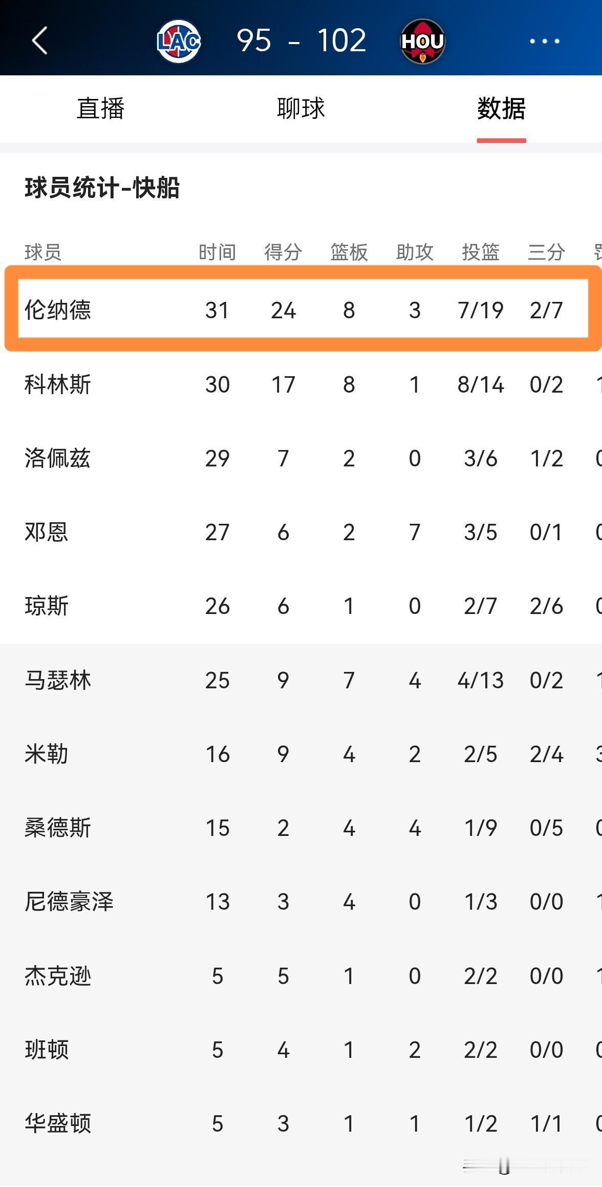 快船超级巨星伦纳德真是大失水准!在今天快船客场以95:102不敌火箭的比赛中,伦纳德的进攻效率非常的低效,他完全没有打出应有的表现。 全场比赛下来,伦纳德首发出战31分钟,投篮19中7,其中三分球7中2、罚球9中8非常低效的得到24分,他的场上正负值为全队最低的-16。 以快船目前的阵容配置来看,只要伦纳德发挥失常,那么快船想要赢球简直难如登天。