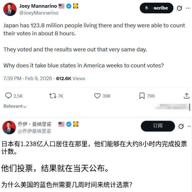 日本这次投票完成之后,美国人很震惊,一个美国人发表疑问说:日本人口有1亿2380万,他们大约在8小时内就完成了投票计票。投票结束当天,结果就公布了。为什么美国的蓝色州要花好几周才能算完票呢? 其实这事儿压根不是谁效率高谁效率低的问题,核心就是两边的选举规则、计票逻辑完全不一样,甚至连追求的侧重点都差得老远。 日本这次众议院选举,投票在当地时间2月8日20时一结束,各投票站就立刻启动了计票工作。日本总人口有1亿2380万,这次参与投票的人数不算少,但计票速度能做到8小时左右出初步结果、当天公布核心走向,提前投票的铺垫功不可没。 日本总务省的数据显示,这次选举有超过2079万选民提前完成了投票。这些提前投出的选票,工作人员已经提前进行了整理和初步统计,并没有等到投票日当天才集中处理。 投票日结束后,工作人员只需要重点统计当天现场投出的选票,再结合提前统计好的提前投票数据,就能快速汇总出结果。而且日本实行的是小选区和比例代表区分开计票的方式,小选区只要统计出得票最多的候选人就能确定当选,不用反复核对,进一步加快了速度。 除此之外,日本的选举计票有统一的流程和标准。全国所有投票站的计票方式、操作规范都是一致的,没有出现各州各自为政的情况。工作人员经过统一培训,计票过程中很少有复杂的验证环节,只要确认选票有效,就可以快速计入统计。 反观美国的蓝色州,计票慢的根源,首先就在邮寄选票的规则上。美国是联邦制,宪法只规定了选举的基本原则,具体的计票细节全由各州自己说了算。 蓝色州大多推行全邮寄选举,或者对邮寄选票的接受度很高。这种方式虽然能提高选民投票率,让更多人有机会行使选举权,但也大大增加了计票的工作量。每一张邮寄选票,工作人员都要单独打开信封,逐一验证选民的身份信息和选票有效性,这个过程本身就很耗时。 更关键的是,很多蓝色州都有邮寄选票的宽限期。根据美国州议会全国会议的数据,全美有16个州允许统计选举日后收到的邮寄选票,只要选票上的邮戳显示是选举日当天或之前寄出的就可以。 就拿加州来说,现在已经把全邮寄选举纳入法律,还规定选票哪怕在选举日后一周内送达,只要邮戳合规,就会被纳入统计。这就意味着,加州的工作人员必须等够这个宽限期,确认没有合规的邮寄选票再送达,才能开始全面计票、核对最终结果。 蓝色州的计票工作,还经常会遇到选举日当天投邮寄选票的瓶颈。过去五次大选中,加州平均有38%的选票是在选举日之后才清点的,2022年中期选举时这个比例甚至达到了一半。 这些选举日当天投出的邮寄选票,和现场选票混在一起处理,进一步拉长了计票时间。而且蓝色州的计票没有统一的标准,不同县、不同投票站的操作节奏不一样,有的地方人手不足,设备更新不及时,也会拖慢整体进度。 还有一点不能忽略,美国蓝色州和红色州的计票优先级不一样。红色州大多收紧了邮寄选票的规则,取消了宽限期,甚至限制邮寄选票的使用,计票自然更快。 蓝色州则更注重保障每一位选民的选举权,哪怕耗时久一点,也要确保所有合规的选票都能被统计到,包括那些因为邮政延误而晚到的选票。这种对包容性的追求,也让计票流程变得更加繁琐,耗时更长。 可能有人会疑惑,同样是民主选举,为什么差距这么大。其实本质上就是两国、两派对选举的侧重点不同。 日本的选举更注重计票的效率和结果的快速公布,通过提前投票、统一流程、简化部分环节,实现了快速计票。美国蓝色州则更注重选举的包容性和公正性,尽可能照顾到每一位选民的需求,哪怕牺牲一点效率也无所谓。 所以说,不是美国蓝色州的工作人员效率低,也不是日本的计票方式更优越,只是两边的规则不同、追求的侧重点不一样,最终才出现了这种天差地别的计票速度。美国人觉得震惊,本质上也是因为习惯了自己州的计票节奏,没接触过日本这种高度统一、高效的计票模式而已。