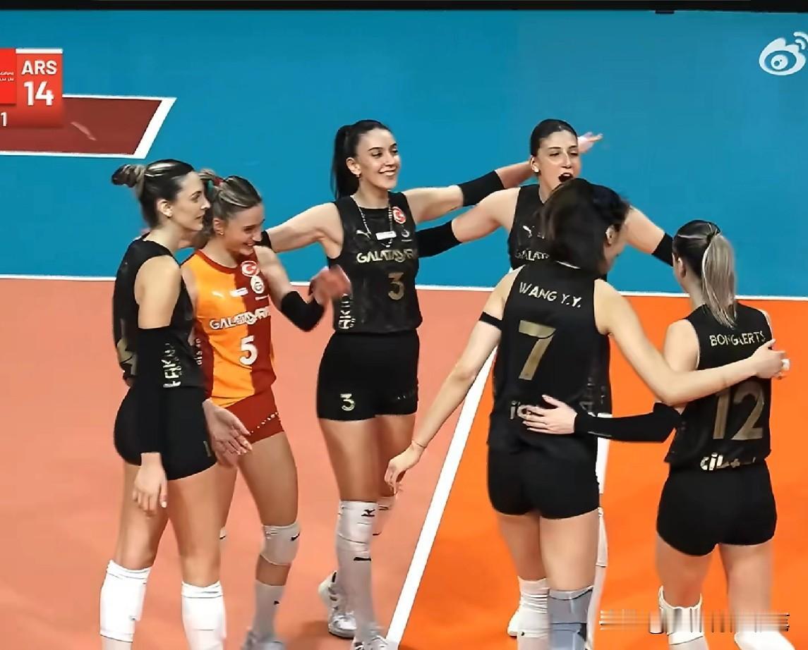 加拉塔萨雷女排队员围成圈,笑得很开心,与阿拉斯货运的比赛,得要感谢王媛媛[击掌] 原来,后三局的赛点时刻,得分全被王媛媛包揽,她一个拦网,两个背飞打得对手毫无还手之力。没成想,王媛媛成了球队关键时刻,拿关键分的关键人物。也要谢谢二传邦加尔茨,她传得球很隐蔽,速度快,位置适中,对手还没来及并拦,媛媛已经下手得分,这配合简直绝了,一起赞赞媛媛[赞]王媛媛拦网 女排联赛外援 加伊塔萨雷女排