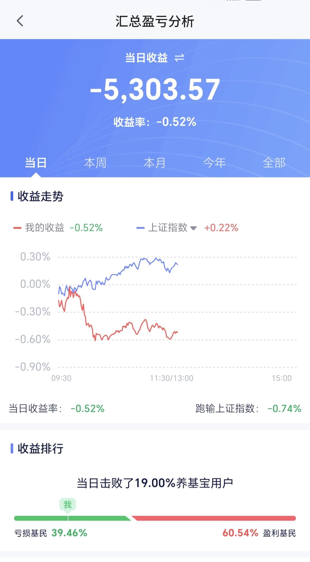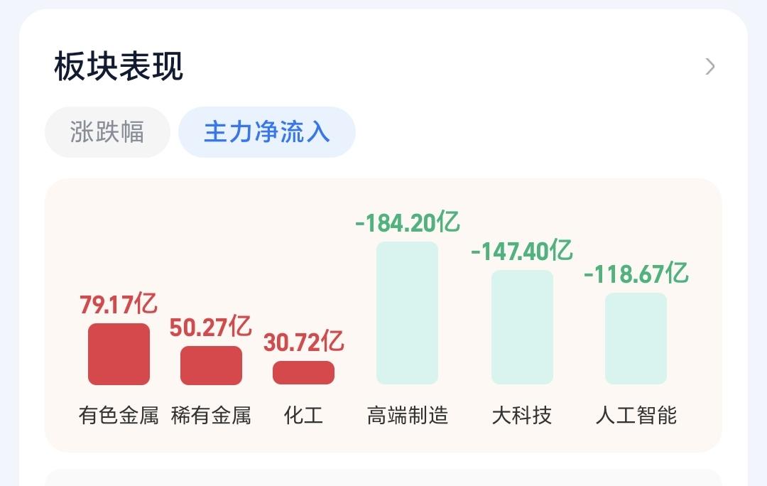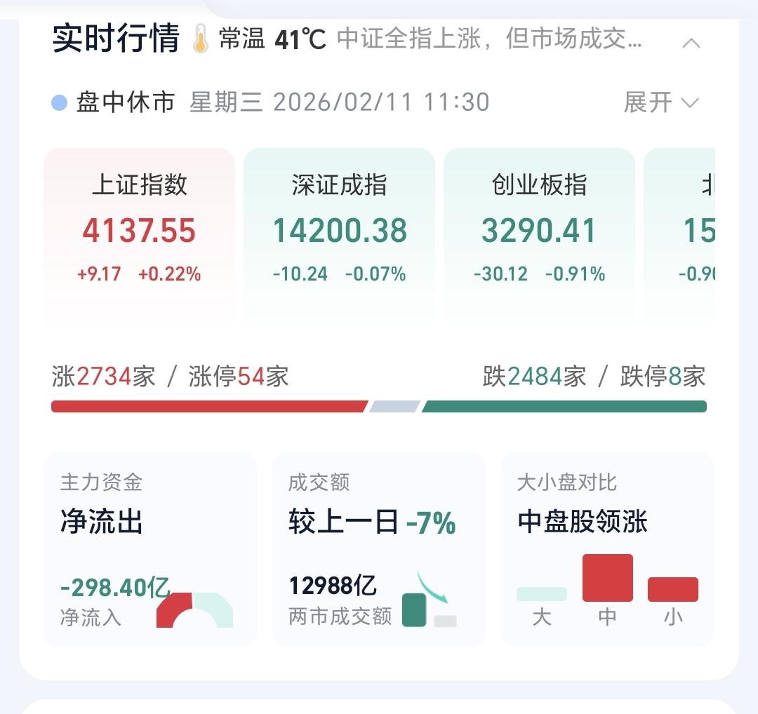 基金:科技类板块震荡调整,这个板块是不是不行了 今天上午指数还是小幅度震荡,震荡的幅度还是非常小,盘中最高4140点,盘中最低4122点,震荡幅度只有18个点,昨天全天的震荡幅度是17个点,两天的震荡幅度都很小,两天的震荡幅度差不多,中午收盘的时候,创业板指下跌了0.91%,收于3290点,上证指数上涨了0.22%,收于4137点。 中午收盘的时候,黄色线在蓝色线上方,但两条线之间的敞口很小,下午继续观察两条线位置会不会有变化,只要黄色线能够保持在蓝色线上方,今天大幅度跳水的可能性就不大。 两市累计成交12988亿,相比于昨天同期缩量了7%,市场上涨2700多家,下跌2400多家涨停54家,跌停8家,主力资金净流出298亿。 主力资金净流入最多的三个板块是:稀有金属板块,有色金属板块,化工板块。主力资金净流出最多的三个板块是:高端制造板块,大科技板块,人工智能板块。 持有的基金亏损5303元,持有亏损率0.52%,盈利金额最大的三个板块是:新能源汽车板块,证券板块,先进制造板块,亏损金额最大的三个板块是:芯片半导体板块,5G板块,创业板指。 上涨幅度最大的三个板块是:稀土永磁板块,黄金板块,有色金属板块,下跌幅度最大的三个板块是:Cpo板块,双创50板块,通信板块。 今天虽然大盘指数是上涨的,但科技类板块的表现并不好,与科技类板块相关的科创50今天是下跌的,中午收盘的时候下跌了0.85%,现在的位置处于日线级别短期下跌通道中,距离下跌通道的上轨线很近,只要有一个稍微的上涨就可以突破这个下跌通道的上轨线,但只要突破不了这条上轨线,日线级别就还是处于下跌趋势中。 科创50板块周线级别处于上涨通道中,处于上涨通道的中间位置,短期的涨跌都改变不了这样的上涨趋势。科创50板块虽然最近是在震荡走势中,但它的大方向是向上的,科技类板块的大方向也是向上的,长线持有的可以继续持有。 今天下午还会是小幅度震荡走势,上涨和下跌幅度都不会很大,大幅度上涨成交量不支持,大幅度下跌有关方面不愿意,也就只能是这样小幅度震荡了。 现在向上的可能性要小于向下的可能性,节前还有两个半交易日,如果向上也达不到我们这一只止盈的要求,如果向下到达捞筹码的地方也不现实,这样的小幅度震荡继续持续下去,越往后就越能确定保持现有仓位过节。 春节之前不会有方向性选择,春节之后方向才会出来,春节之前并不是重要的时间节点,春节之后的时段才重要,到时候很快会确定是再一次止盈,还是要捞回止盈筹,因为我们需要在阶段性下跌之前降一下仓位,在阶段性上涨之前提一下仓位,到时候我们根据盘面情况再做决定。 今天是我们南方人的小年,从今天开始就正式过年了,祝大家新年快乐,祝大家心想事成,祝大家持有的基金红红火火,没有时间看盘的人可以不用看了,下午两点之后,收盘之前,再来稍微看一下就可以了。