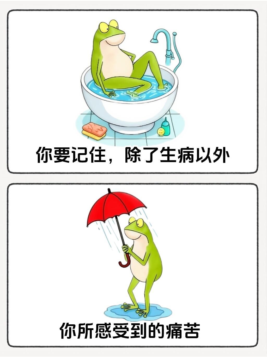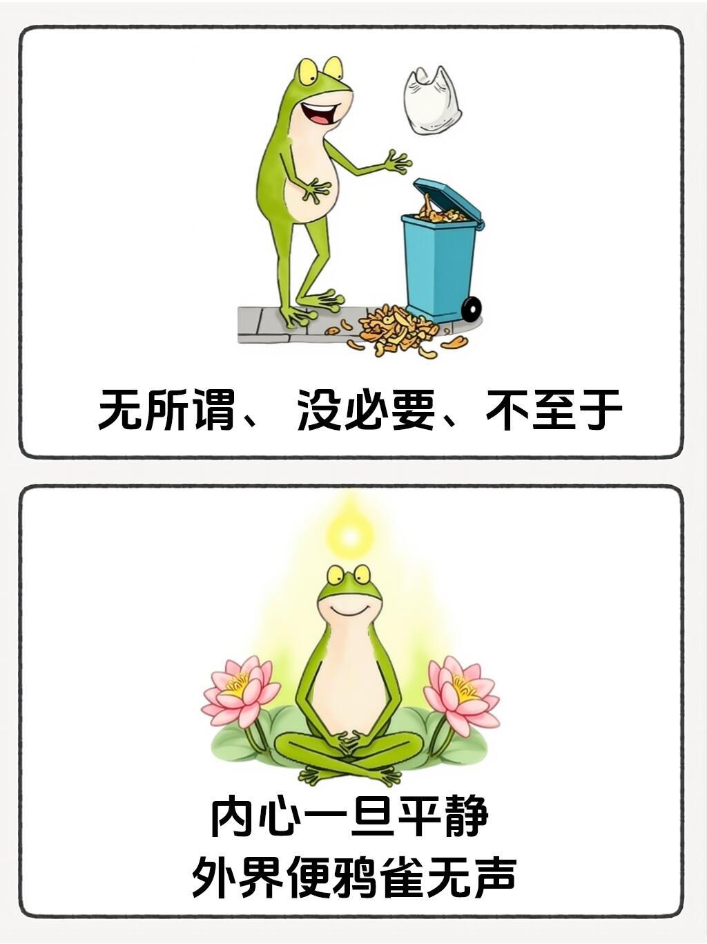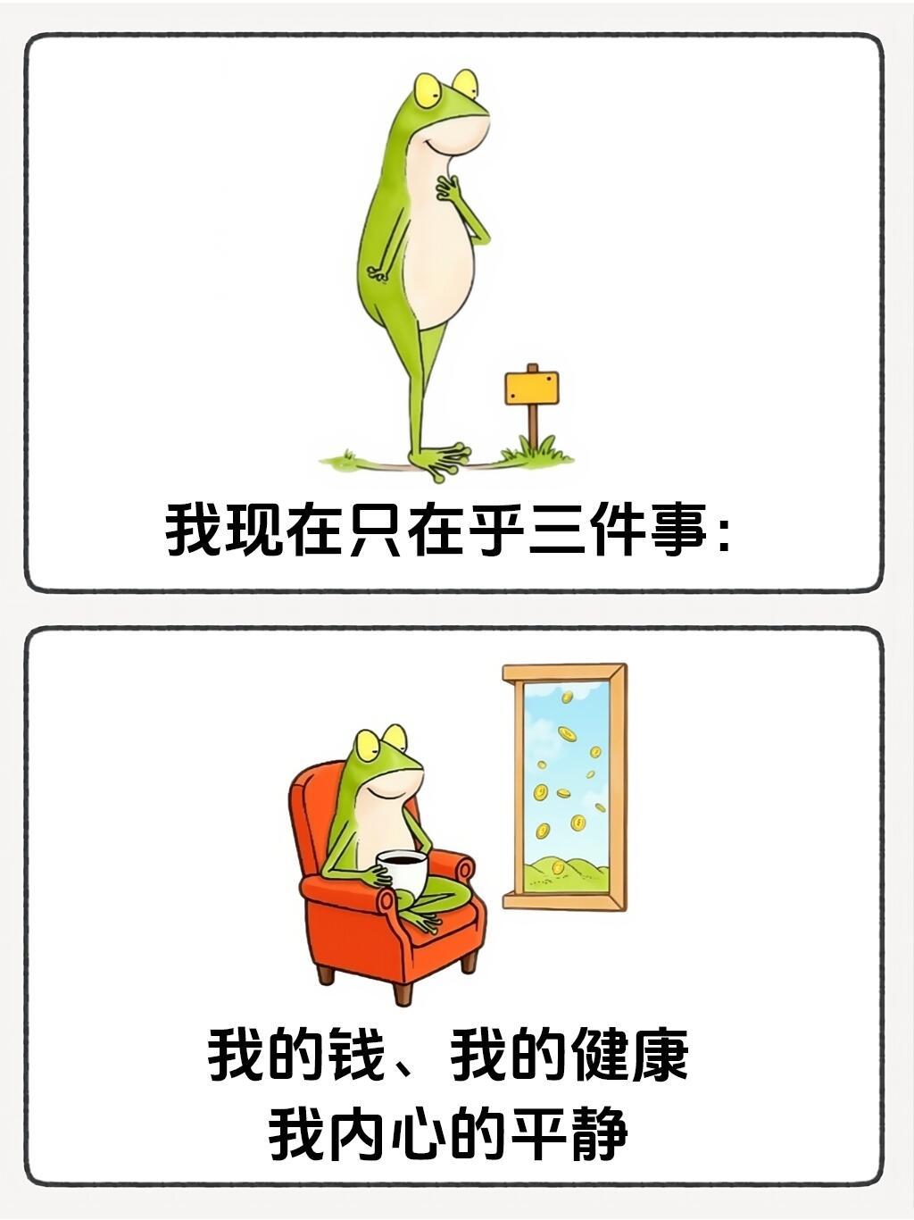 蛙蛙的人间清醒指南✨ 1. 关于痛苦 除了身体的病痛,我们感受到的所有委屈、焦虑和不甘,其实都源于自己的执念和期待,而非生活本身。那些让你辗转反侧的事,换个角度看,不过是价值观编织的一场梦。 2. 关于在乎 人到了一定年纪,就该学会做减法。我现在只在乎三件事:口袋里的钱、身体的健康,还有内心的平静。其他的,真的没那么重要。 3. 关于内耗 事情已经发生,就别再反复咀嚼了。事后还在脑子里翻来覆去,就等于让自己又被伤害了两次。而那些还没发生的坏事,就别提前为它买单了,不然你会被自己的想象力活活累死。 4. 关于压力 别再相信“压力转化为动力”的鬼话了。大多数时候,压力只会转化成病历。真正的动力,从来不是逼出来的,而是源于内心对快乐和自由的渴望。 5. 关于得失 如果事与愿违,请一定相信,那是生活另有安排。它拿走你一样东西,是为了给你腾出双手,去接住更好的礼物。 6. 关于心态 遇事默念三遍:无所谓、没必要、不至于。当你的内心足够平静,外界的所有喧嚣,都不过是过眼云烟。 7. 关于快乐 接纳自己的不完美,允许别人做别人,也允许自己做自己。这才是保持快乐的终极秘诀。