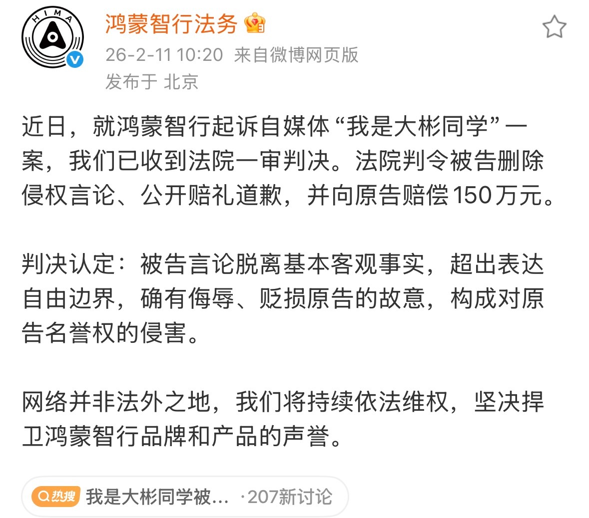 我是大彬同学被判赔鸿蒙智行150万 鸿蒙智行法务:近日,就鸿蒙智行起诉自媒体“我是大彬同学”一案,我们已收到法院一审判决。法院判令被告删除侵权言论、公开赔礼道歉,并向原告赔偿150万元。