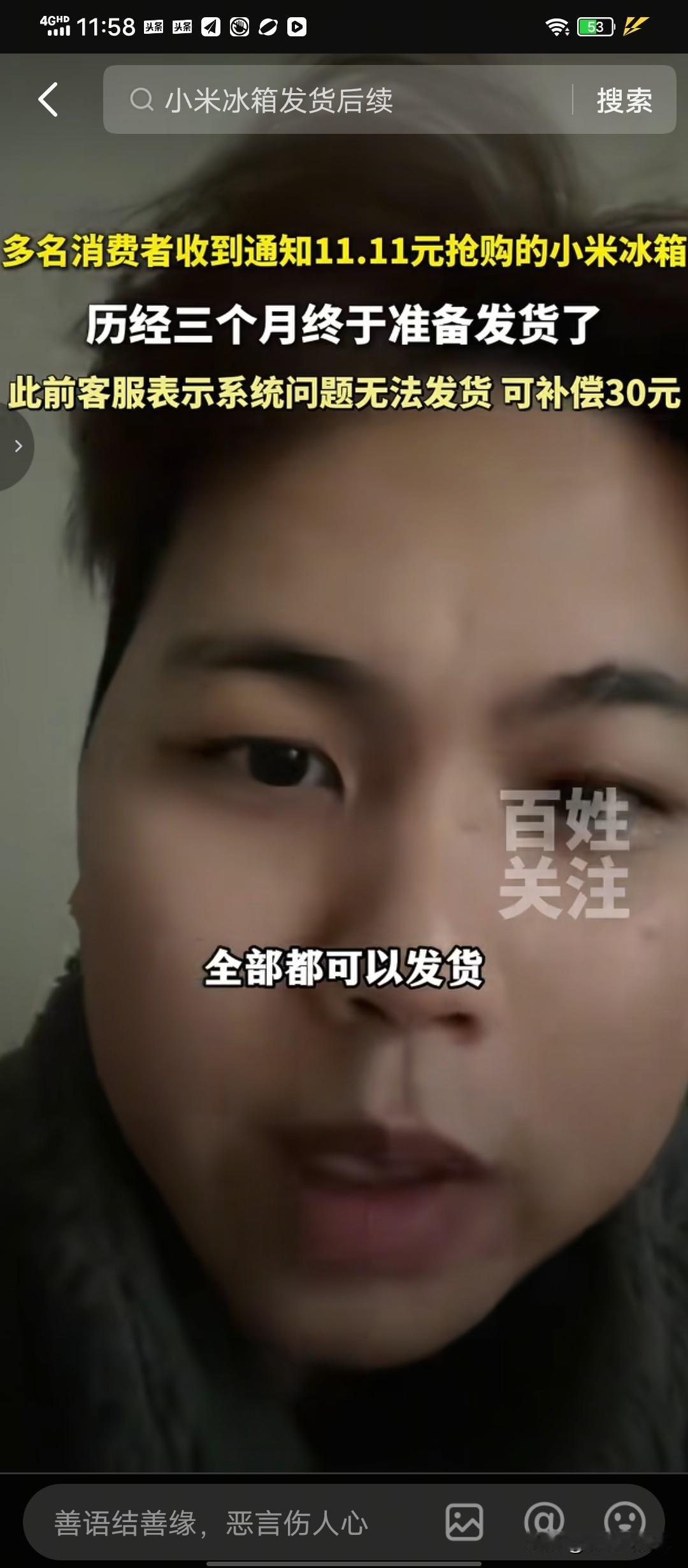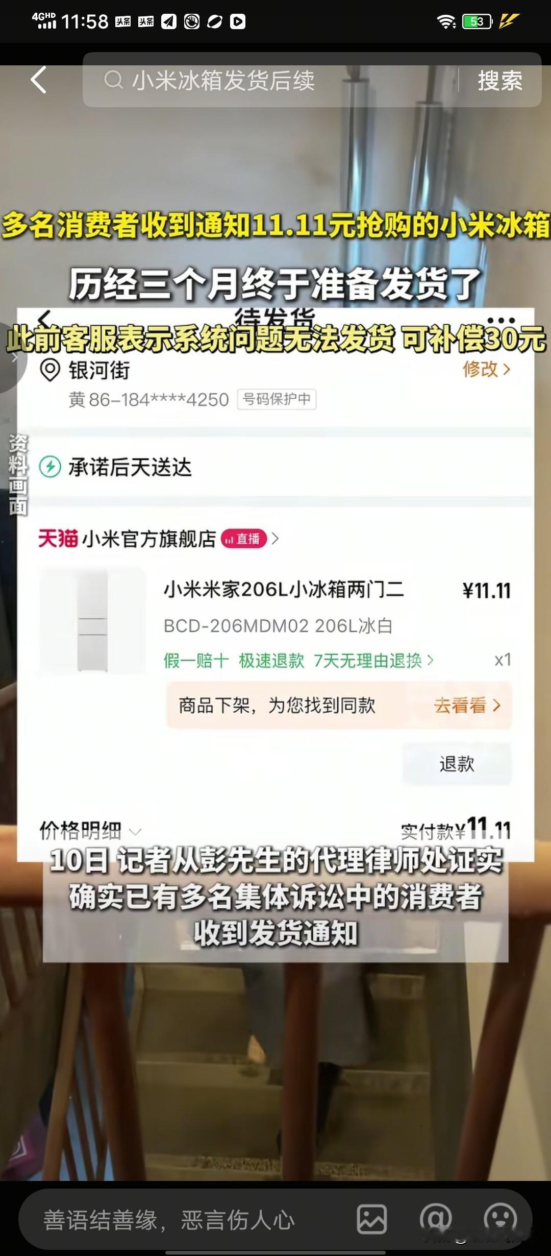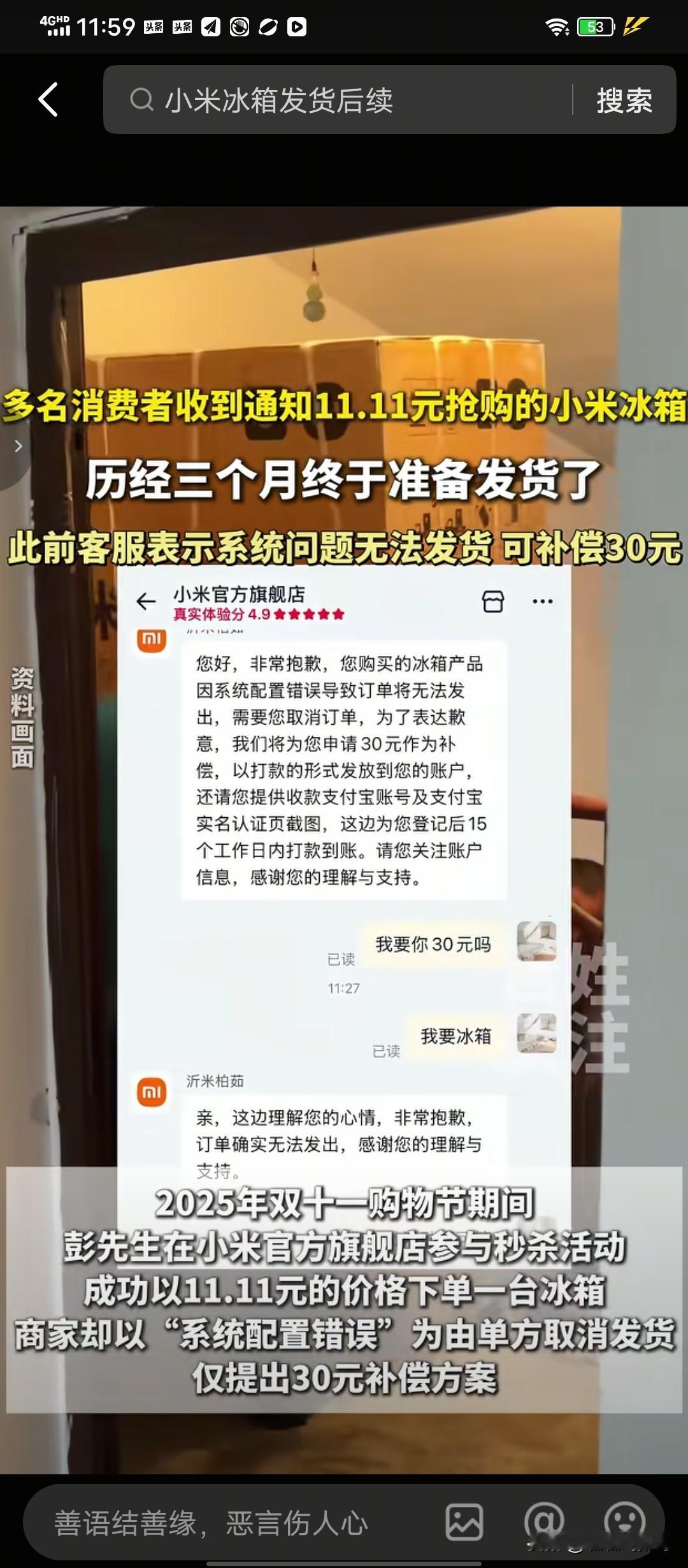 何苦呢 ? 某米冰箱输了诚信口碑,最终还是发货了 ! 去年双十一,某米品牌冰箱搞促销,发起11.1元抢冰箱活动 。 有网友下单11.1元购买成功。 满心期待冰箱上门 , 结果商家说是系统出错, 并非商家的意思 ,11.1元购买冰箱不算数,单方面取消订单, 品牌方选择以30元红包补贴用户。 网友对品牌方这种处理方式非常不满意! 既然我已成功下单购买,商家就应该履约发货。 你说是系统出错,那是你跟平台的纠纷, 不能失信消费者,让消费者买单 , 要求商家发货。 双方经过多次沟通,商家依然坚持不发货 。 于是下单成功购买的几个消费者联合起来集体向商家发起诉讼 。 眼看开庭在即 ,2月8日,有网友接到品牌方的电话,说11.1元购买的冰箱将发货 , 叫网友核实收货地址。 2月10日,有网友发视频说已经收到了冰箱, 下单购买的是两开门冰箱,现在收到的还是三开门冰箱。 对这种冰箱非常满意,还是感谢商家履约 。 商家这份履约还是来得迟了一点 。 如果消费者选择了退缩,忍让,不发起集体诉讼, 商家会履约吗 ? 这不得不让人怀疑商家这份履约是不得已的认怂,明白打起官司来自己会输,最后还是得发货, 还不如在法院判决前发货,这样自己理亏,输得不那么难堪。 诚信是商家立足之本 ,订单是契约,履约是底线 。 某米冰箱发了冰箱又输口碑,得不偿失。 只是不明白某米品牌是知名企业, 一年做公益都会花很多钱,为什么 会在乎冰箱这点小钱不履约呢?