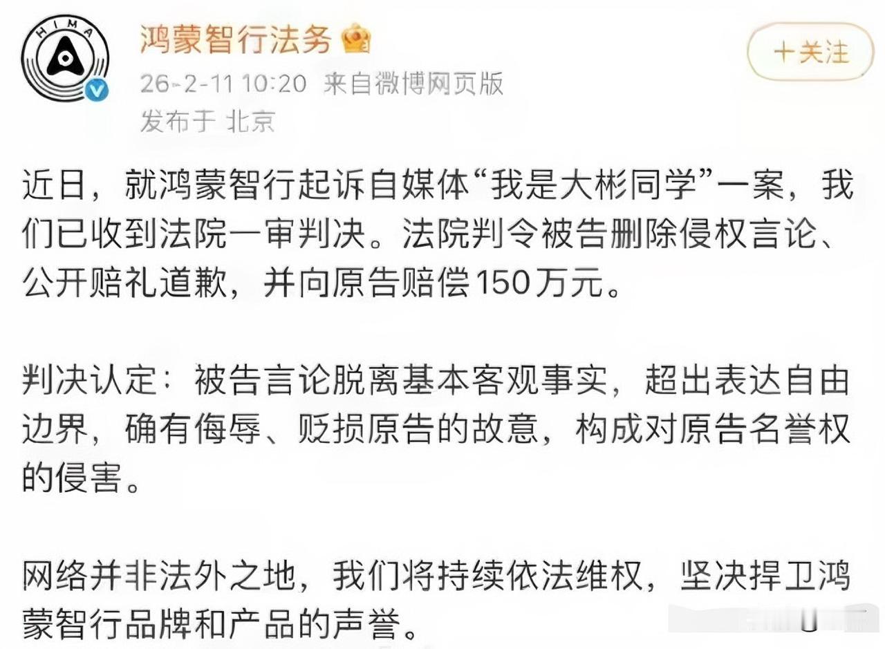 鸿蒙智行法务部出手:自媒体“我是大彬同学”被判赔鸿蒙智行150万,并公开赔礼道歉! ​​​ 就在刚才鸿蒙智行法务部官方社交账号发出了这一条简短的消息! 因为在这之前,自媒体账号“我是大彬同学”,就已经被禁止关注了,他现在能够对外发声的途径就是他的个人微信号。 而且这个事情也已经过了一段时间了,没想到还没有完全结束,随着今天鸿蒙智行官方发出来的这条消息,也就意味着,这个自媒体博主对鸿蒙智行名誉权的侵害,形成了事实。 赔偿150万,对于普通老百姓来说,真的不是一个小数字,只是不知道对于已经做了很多年次媒体的这个博主来说,这个数字意味着什么。 看来现在的自媒体,在社交网络上表达东西的时候一定要出于客观事实,同时要遵守平台以及相关的法律规定,在这些基础上还是要谨言慎行,不然的话,最终自己闯的祸还得自己来负责任才行。 其实不仅仅只是汽车这一个行业,在很多行业做自媒体都是这样的,不要为了流量,偏离了客观事实,甚至说一些不真实的话,做一些不真实的事,最终这些责任,只有自己来承担。 当然,这个博主最近可能心情不太好,因为不仅仅只是这一家企业在起诉他[捂脸]