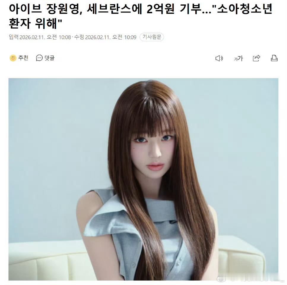 张元英向韩国世福兰斯医院捐款共2亿韩元,用于支持儿童及青少年患者的治疗。 张元英捐款2亿韩元