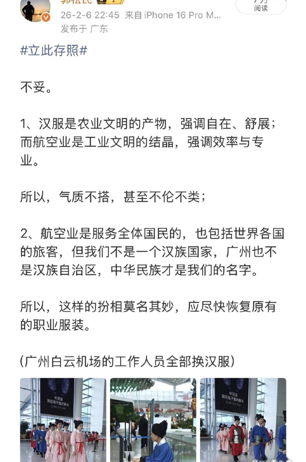 哈哈哈哈哈哈,我要笑喷了,这个郭x民是谁啊?完全不认识他! 他居然批广州白云机场工作人员换成汉服,说是不伦不类,气质不搭! 还说汉服是劳动文明产物不适合工作!又说我们中国不是汉族国家,中国没有汉族自治区,官方性质机构的工作人员不该穿汉服! 这货有什么资格定义工作该穿什么?穿西装的时候没见他这么破防过!广州机场文化自信的实践落地咋就让他这么闹心?!那么害怕中国文明从历史走出来?! 传统从未束缚我们,束缚人的往往是那套“必须和别人一样”的思维裹脚布。 汉族人不能有人权和尊严?!不能穿本民族服饰?!少数民族可以穿自己民族服装工作,汉族不能?!这货说自己是汉族,我怎么那么不信呢?纯汉族汉子哪能站不直?!贬低汉族?!披着羊皮的狼吧,混进汉族队伍里故意带节奏,故意挑动民族不合吧![抠鼻][抠鼻][抠鼻]广州机场汉服 中国该不该推广汉服