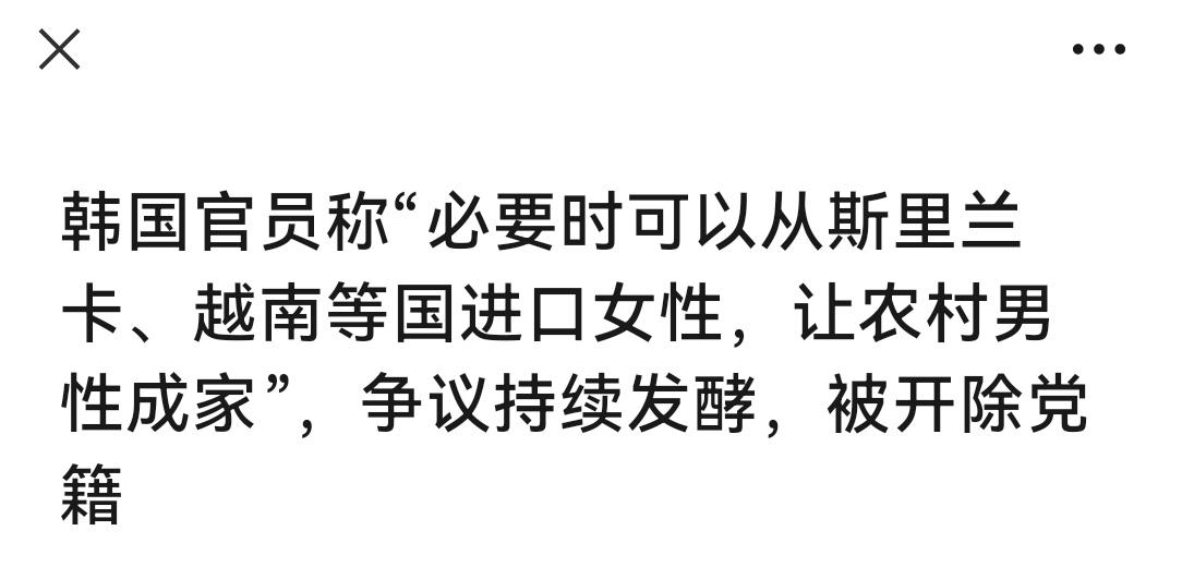 “必要时可以从斯里兰卡、越南等国进口女性,让农村男性成家”? 韩国的结婚率一直低,出生率更低。其根本原因,就是男权至上,女性没有社会地位,感受不到平等尊重。 看不到希望,看不到未来,韩国女性只好用不婚不育无奈反抗。 堂堂韩国官员,不倡导尊重女性,反而把女性当商品,说“进口”,并不认为这样说有什么不妥。 韩国人的大男子主义可见一斑,他们所生活的人际环境,对这样的观点应该是比较接纳的。