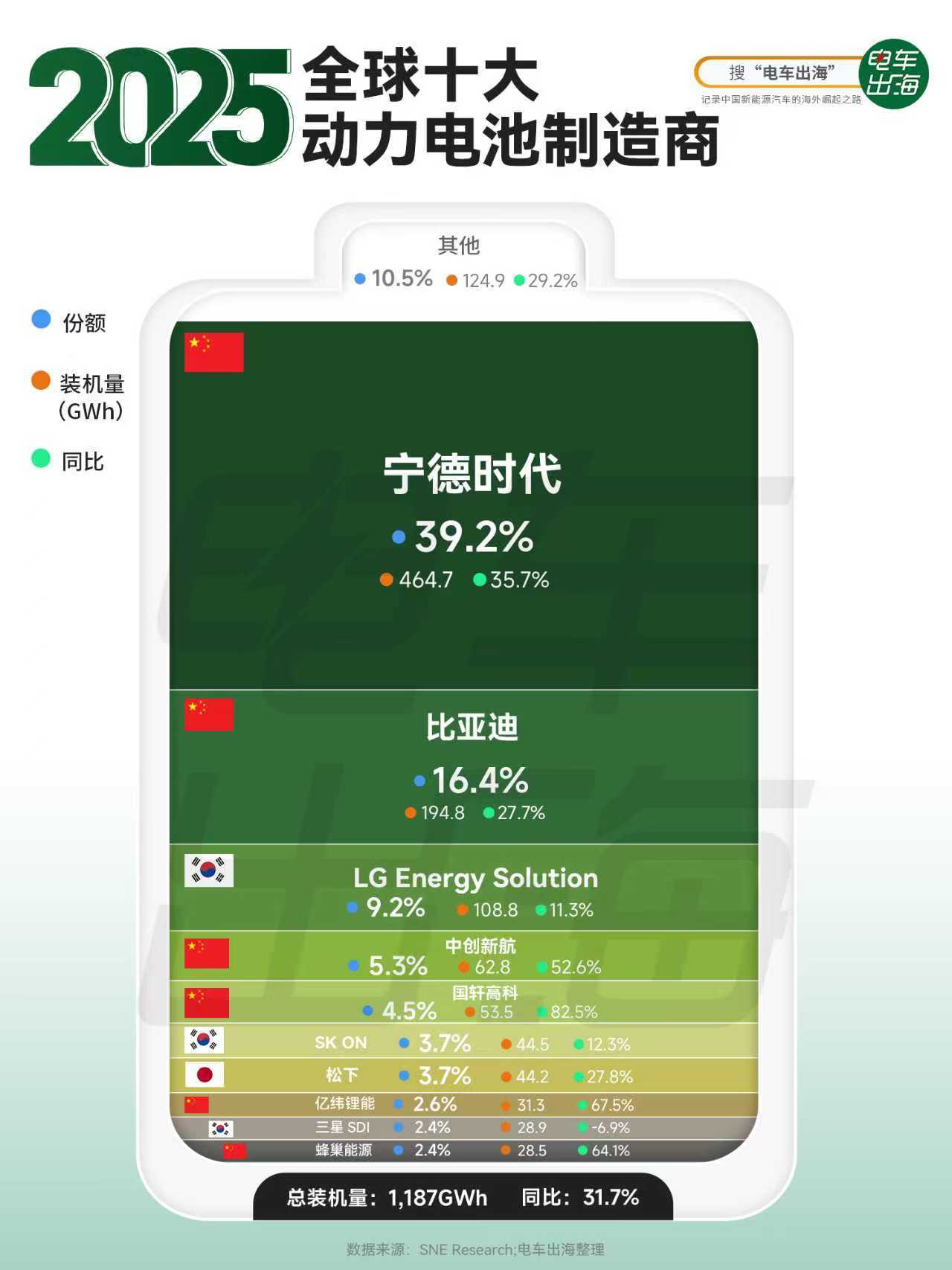 2025年,全球电动汽车电池装机量(含中国市场)为1187GWh,同比增长31.7%。