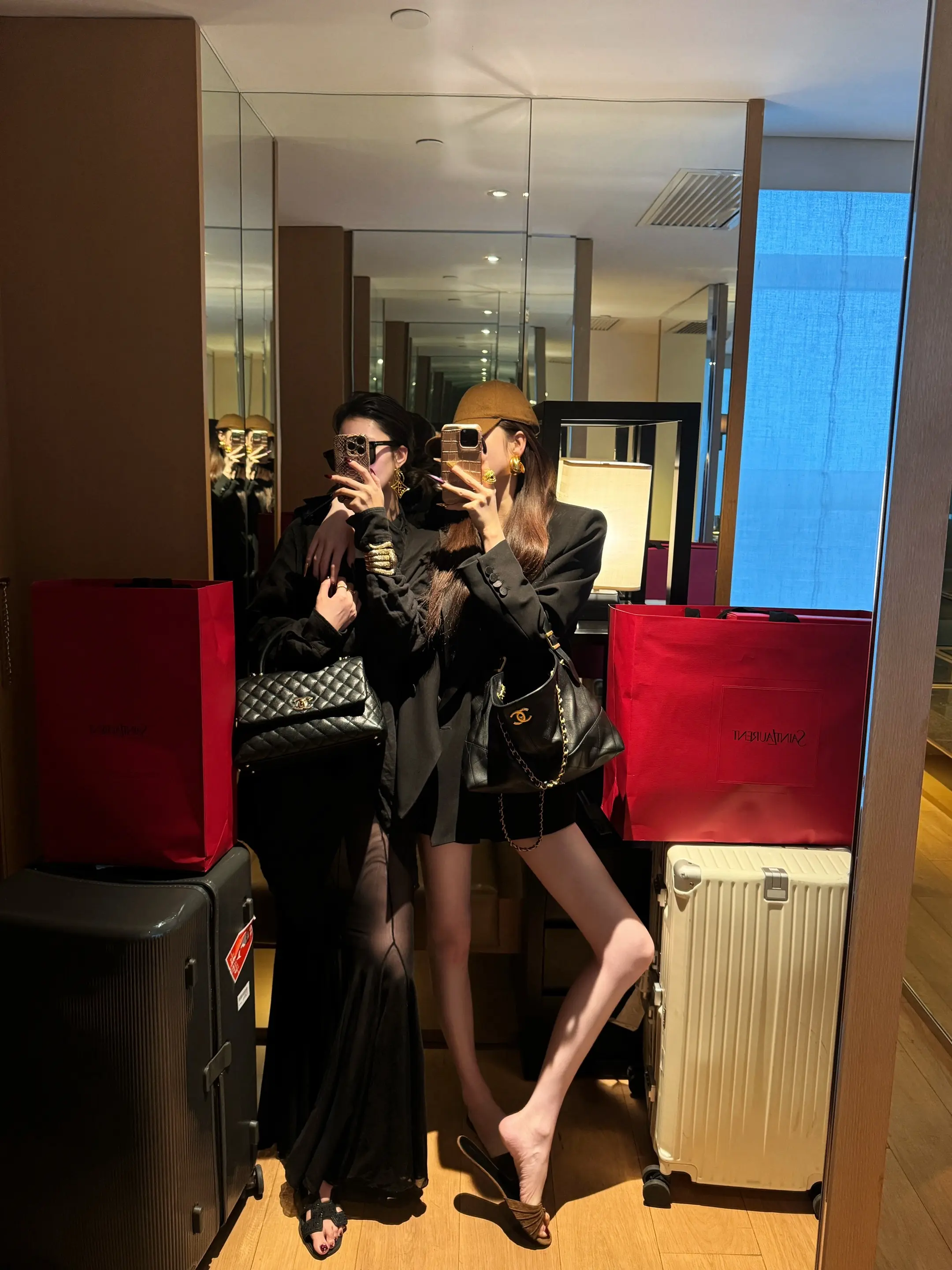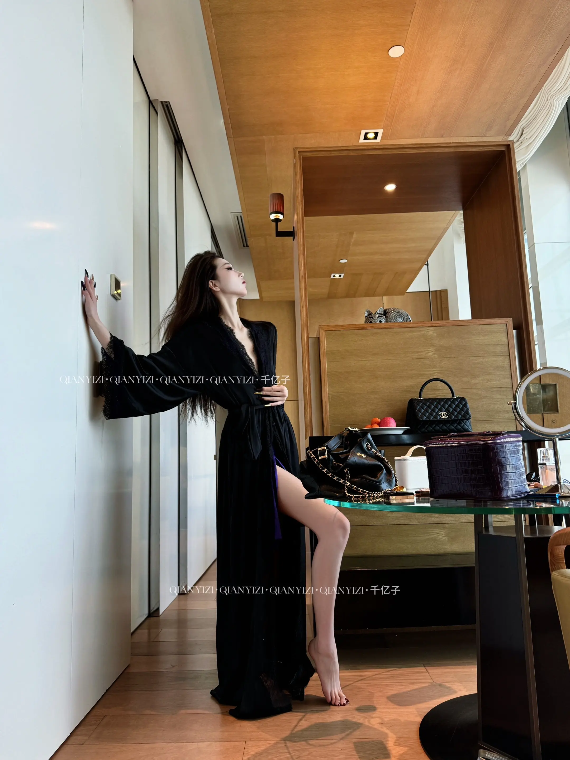写真深V黑色衬衫搭配白色短裙真的好精致