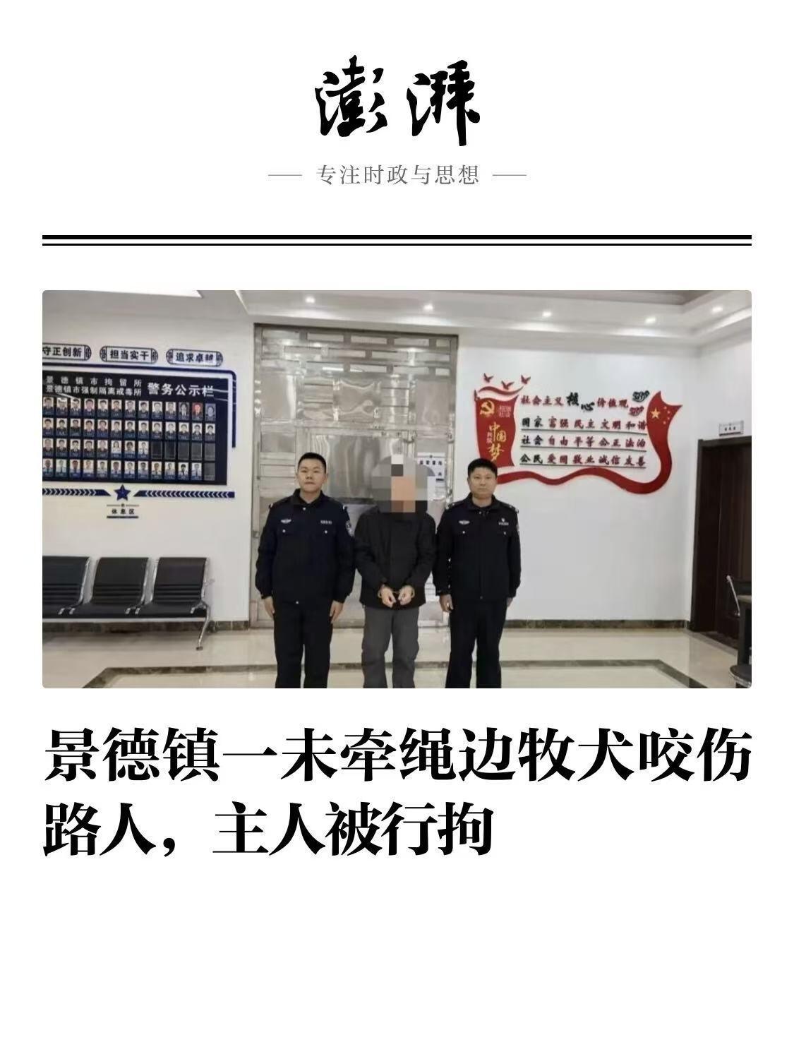 景德镇这事儿挺典型的,给大家敲了个警钟。一个边牧没牵绳,把路人给咬了,现在狗主人直接被拘留了。要我说,抓得好。 事情是1月19号出的,在浮梁镇美院星城。路人宋某好好走着,就被居民涂某某那只没拴绳的边牧冲过来咬了。报警后,警察一查,遛狗不牵绳,导致狗失控伤人,这行为在新《治安管理处罚法》里,属于“未对动物采取安全措施致使他人受伤”,而且情节算重的,够得上拘留了。最后处理结果是狗主人涂某某被行政拘留,还得赔人家医药费。 这里的关键点是,今年(2026年)1月1号开始,新修订的《治安管理处罚法》正式生效了。里边的第八十九条写得明明白白:没给动物采取安全措施,导致动物伤了人的,可以罚一千块以下;要是情节重,那就得进去蹲五到十天。遛狗不牵绳,就是最典型的“没采取安全措施”。以前可能很多时候批评教育、罚点款就完了,现在新法是动真格了,真能拘人。 我看网上有些人可能觉得,“我家狗很乖”、“不咬人”,但这真不是理由。狗毕竟是动物,再聪明也有受惊、兴奋的时候,路边突然窜出个车、遇到别的狗,谁都保不准它会怎样。一根牵引绳,既是保护路人,也是保护狗自己,别让它乱跑被车撞了或者走丢了。说到底,这是基本的养狗责任,也是对别人的尊重。 现在新法给了更硬的处罚依据,对那些总抱着侥幸心理、觉得“没事儿”的狗主人,算是上了一道紧箍咒。希望这事儿能让更多人长记性:文明养狗不是口号,遛狗牵绳是底线。别等出了事,赔钱又进去,才后悔。