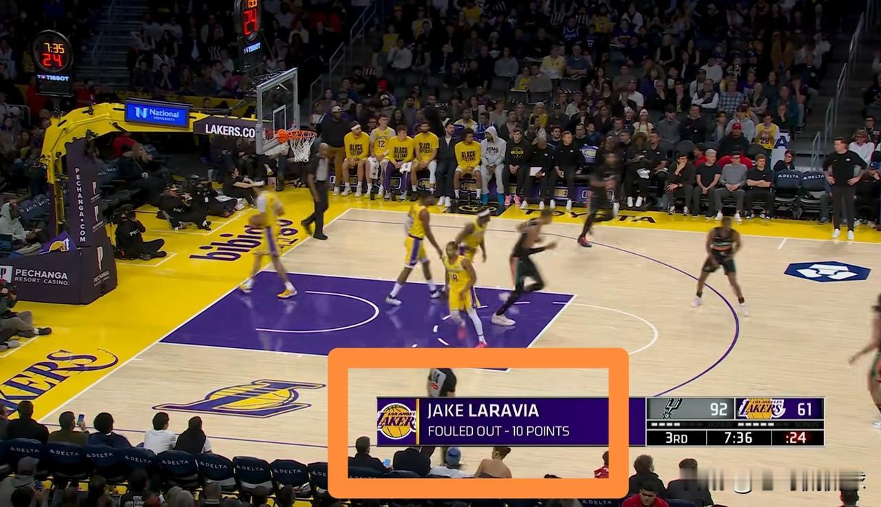 湖人大将拉拉维亚真是太悲催了!在今天湖人主场迎战马刺的比赛中,当时比赛进行到了第三节的7分43秒,拉拉维亚在篮下防守文班亚马时被裁判吹罚了防守犯规,从而吃到了个人本场比赛的第六次犯规。今天的拉拉维亚真是太悲催了,他仅仅首发出战18分钟就六犯离场,在离场之前,拉拉维亚得到10分2篮板1助攻。 随着拉拉维亚的六犯离场,湖人可以彻底的缴械投降了。
