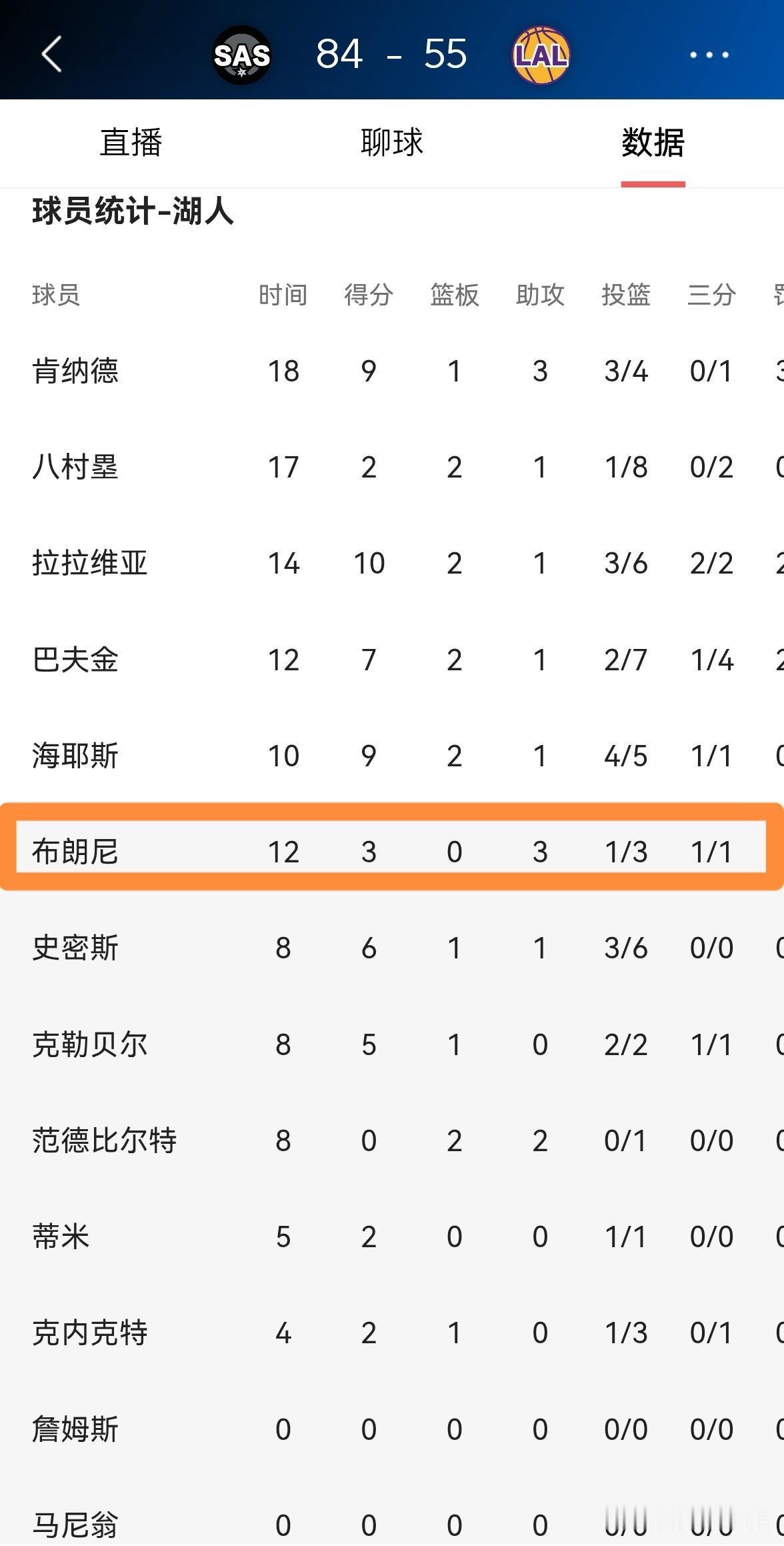 我强烈建议湖人主帅雷迪克将布朗尼提上首发!在今天湖人主场迎战马刺的比赛中,目前双方半场战罢,湖人以55:84落后于对手。在前两节比赛中,布朗尼替补出战12分钟,投篮3中1,其中三分球1中1得到3分,还有3助攻,没有出现任何的失误,他的场上正负值为-12。 老实说,如果湖人主帅雷迪克能够在下半场比赛中将布朗尼提上首发,我相信湖人在下半场比赛中的表现会有很大的起色,因为布朗尼的防守能力要比巴夫金强的多。