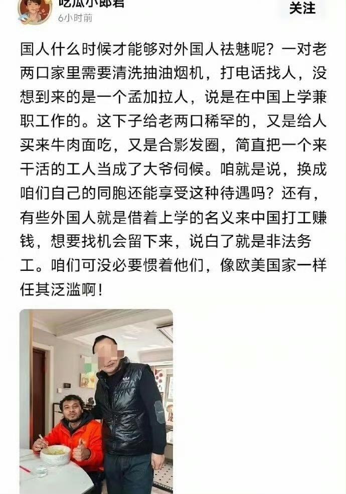 现在洗抽烟机都没有国人干了吗?有老两口过年找家政,结果来一个孟加拉国留学生,说是放假搞兼职。这老两口看到是个外国人,是又惊又喜,端茶倒水一通嘘寒问暖,小哥没吃饭,还先给他下了一碗牛肉面,又是和留学生小哥合影,这哪里是请来干活的,分明是家里的贵客。就差让小哥坐着,老两口把洗抽油烟机的活给干了。你们说,这要是国内同胞上门服务,老两口会如此热情吗?只怕都是横挑鼻子竖挑眼,哪哪不对。清洗抽烟机