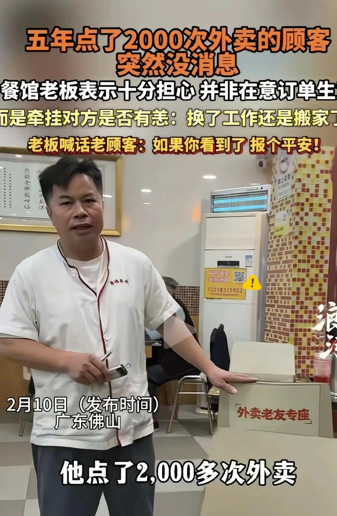 广东佛山,一男子开了家粤菜馆,有个顾客5年点了2000次外卖,突然1年多都没下单,男子很是牵肠挂肚,不是想赚钱,是真心担心对方的安危。 五年两千单,早已不是生意,是陌生人之间最踏实的陪伴与信任。 素未谋面,却把彼此当成了老熟人,这份不掺功利的惦记,在快节奏的当下格外珍贵。 老板隔空喊话:看到了报个平安。 简单一句话,藏着最朴素的善良。网友也都温柔祝福,宁愿相信他是成家有人做饭,或是换了更好的生活。 人间最暖的从不是山珍海味,而是烟火气里的彼此牵挂。 愿这位老顾客平安顺遂,也愿心软善良的老板,生意长红,被温柔以待。 你生活里遇到过这样暖心的陌生人吗?