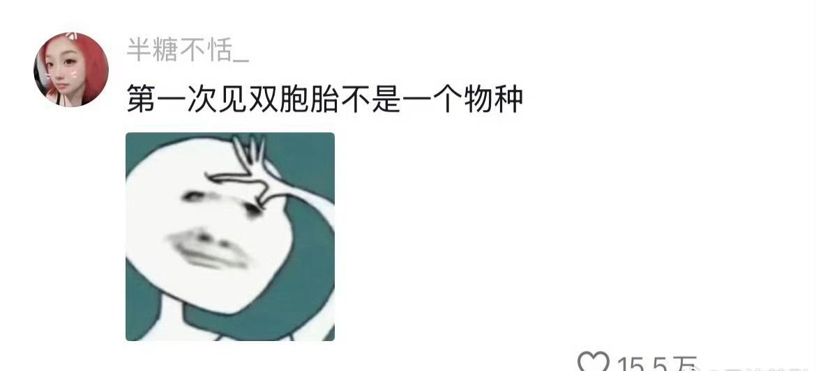 第一次见双胞胎不是一个物种"第一次见双胞胎不是一个物种"是2026年初爆火的网络热梗,核心是用夸张的"跨物种"比喻调侃两类现象——宠物与主人神同步的表情动作,以及外貌性格差异巨大的双胞胎,本质是对"相似性刻板印象"的幽默解构。