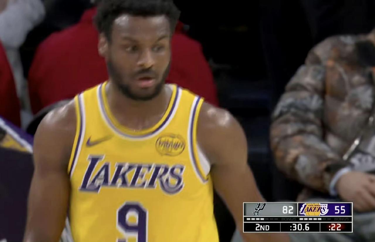 每当湖人大比分落后,布朗尼总是负重前行! 本场对马刺,文班亚马第一节就25分,第二节拿到37分,比赛就结束了。 这个时候湖人只能让布朗尼去打,可惜他中了一个三分,之后也隐身没有表现。[可怜]