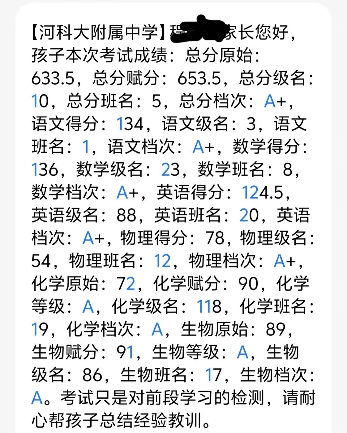 高二卓越班期末考试成绩,总分633.5赋分后653.5班级第五名,年级第十名,优秀的孩子各科都是A,语文134A+单科年级第三名,数学136A+单科年级23名,英语124.5A+年级88名对于年级第十名来说有些拉分,物理78A+年级54名,其他两科为A等级,保持好能走好比较不错的985大学。