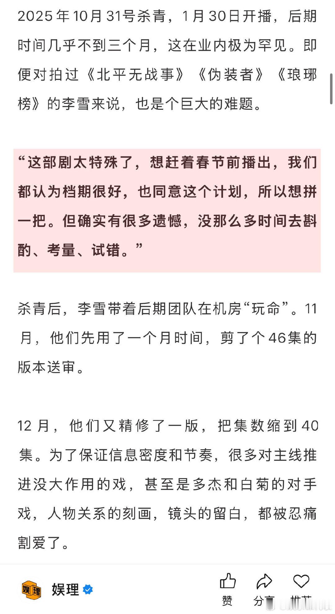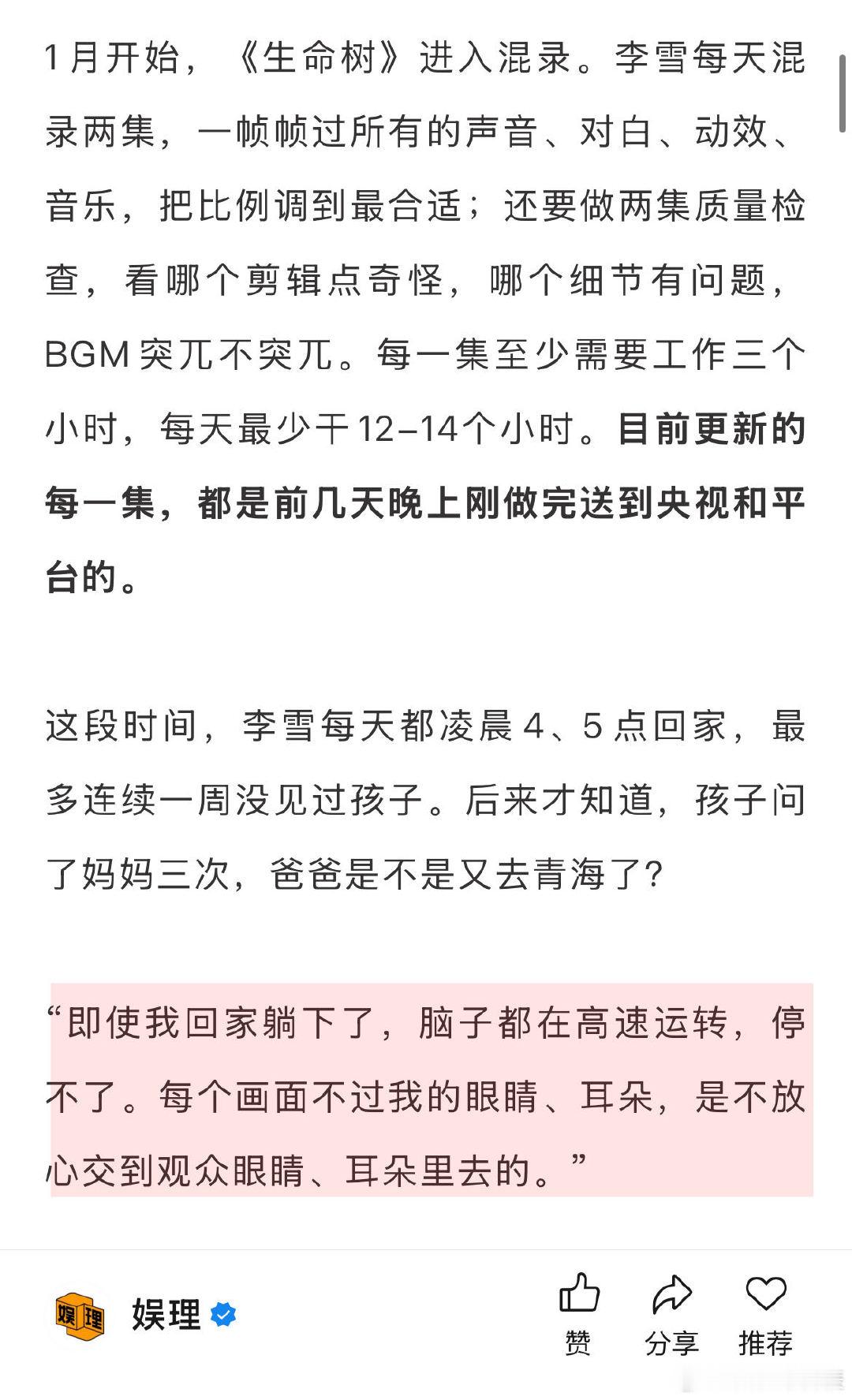 导演回应生命树豆瓣一星差评 生命树导演说很佩服杨紫《生命树》在2025年末杀青后,导演李雪带着后期团队在机房“玩命”。去年11月,他们先用了一个月时间,剪了个46集的版本送审。12月,他们又精修了一版,把集数缩到40集。为了保证信息密度和节奏,很多对主线推进没大作用的戏,甚至是多杰和白菊的对手戏,人物关系的刻画,镜头的留白,都被忍痛割爱了…杨紫胡歌拍生命树都出现了高反↓