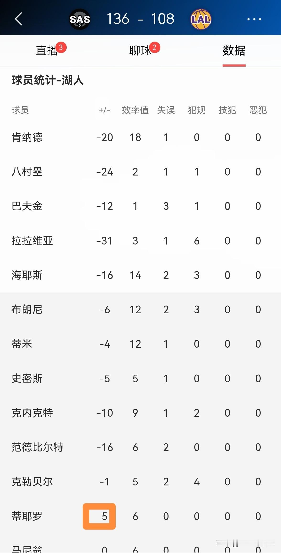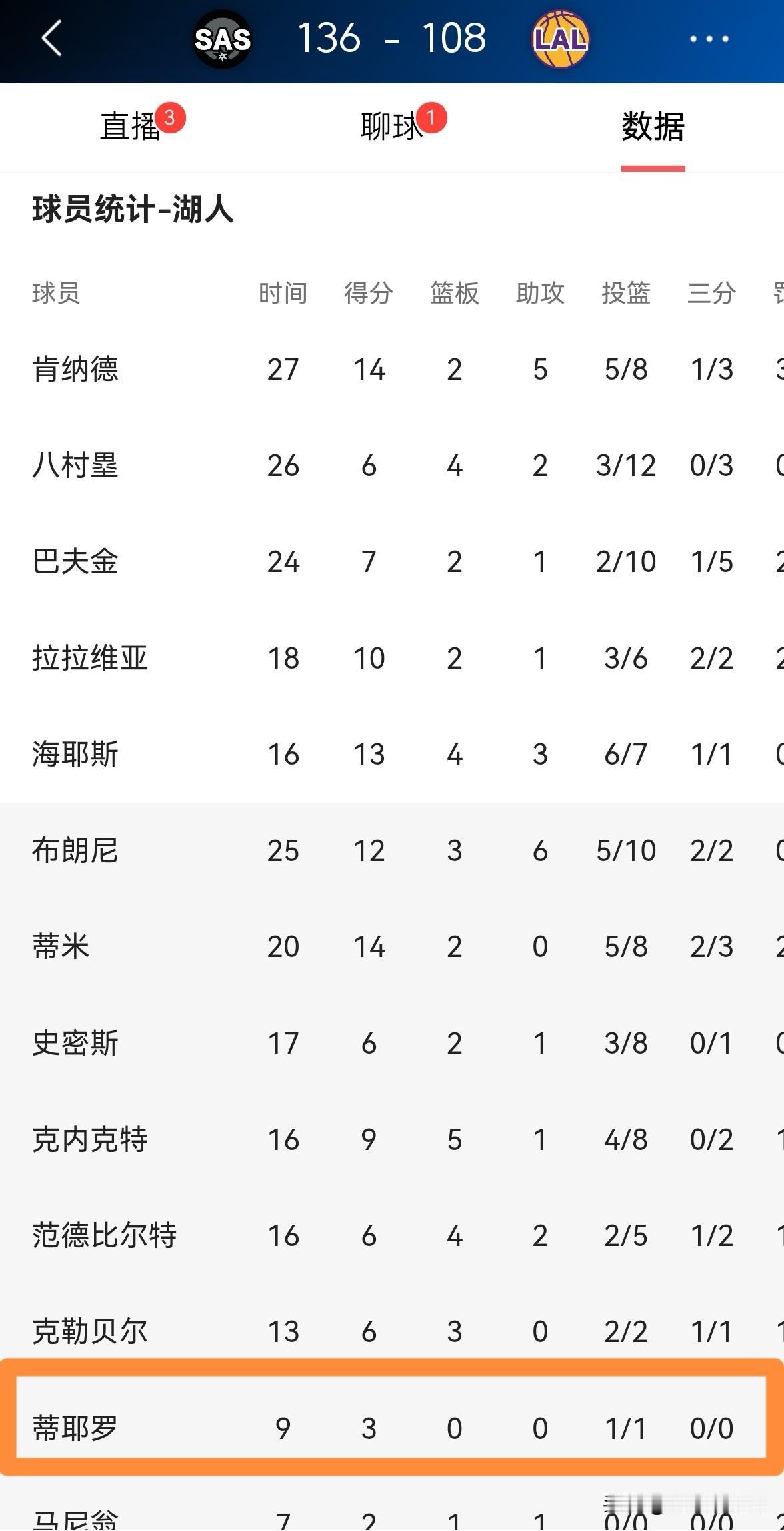 湖人新秀蒂耶罗真是一枝独秀!虽然今天湖人在主场以108:136惨败于马刺,但是小将蒂耶罗的场上正负值为+5,他是湖人阵中场上正负值唯一为正值的球员,可以说是一枝独秀。 整场比赛下来,蒂耶罗替补出战9分钟,投篮1中1,其中罚球1中1得到3分1盖帽,没有出现任何的失误和犯规,他的场上正负值为球队最高的+5。