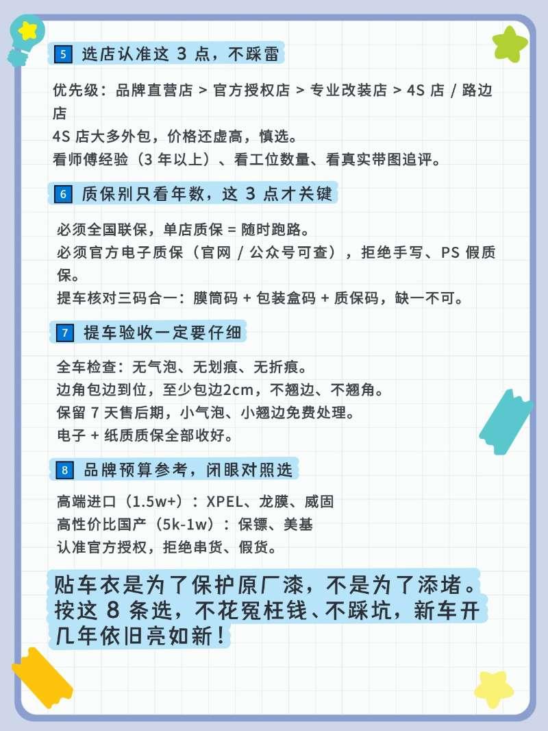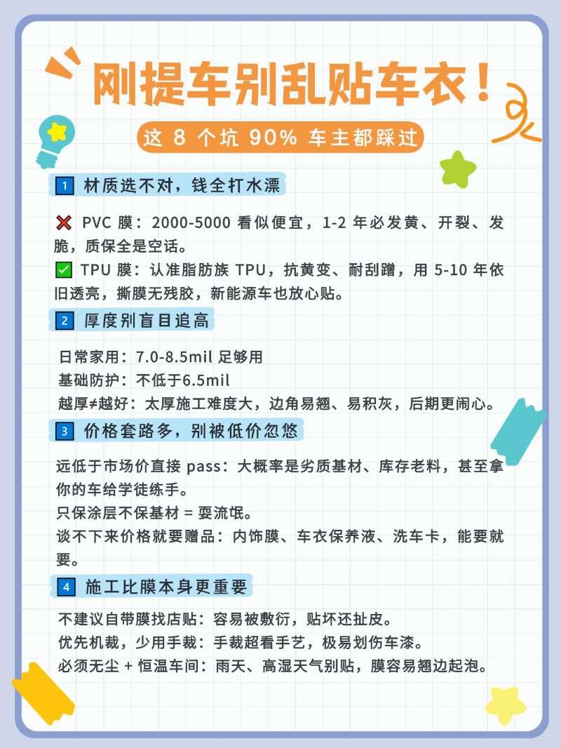 刚提车别乱贴车衣!这 8 个坑 90% 车主都踩过刚提新车就急着贴车衣?千万别冲动!选错材质、找错门店,轻则发黄起泡、边角翘边,重则撕膜留胶、划伤原厂漆,反而越护越伤。先把这 8 条避坑指南吃透,再贴绝对不亏!【来自懂车帝车友圈】