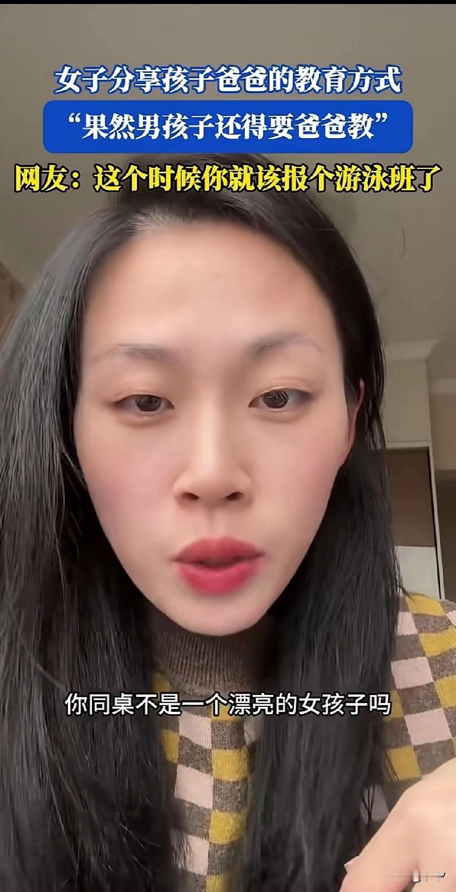 刷到一个视频,女子分享,果然孩子还得爸爸教她说她的儿子要换同桌!因为儿子的同桌是个漂亮女生,经常抄他的作业… 她已经劝过自己的儿子理由不充分,并且她儿子的老师已经当面拒绝了她的儿子,所以她也没有给儿子的老师发私信! 结果她的儿子在家中又提起了这个事儿,这让她非常的烦,结果她的老公问了这个事! 然后给她的儿子说你的同桌是个漂亮的女孩,爸爸小时候就经常找漂亮的小女生玩! 她的儿子本来还不明白,后来直接get到了他爸爸的想法,两个男孩子果然能够聊到一起,两个人就聊了很久! 他爸爸的理由就是,你给她抄作业,漂亮的女同桌,给你提供情绪价值,并且会一直崇拜你! 从此以后,她家儿子再也不提换座位的事儿,还说自己天天给她抄作业,每天回家都乐呵呵的! 网友表示你家孩子适合报个游泳班? 大家知道网友的意思是什么吗?