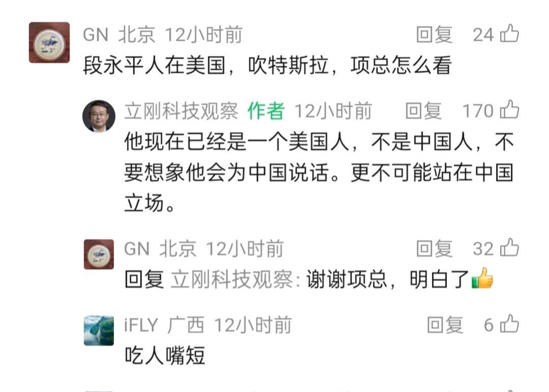 项立刚点评段永平。 2月9日,有网友给项立刚先生留言说,段永平人在美国,吹特斯拉,项总怎么看? 项立刚看到留言后说,他现在已经是一个美国人,不是中国人,不要想象他会为中国说话,更不可能站在中国立场。 项立刚先生的一番话,还是要重新思考定位的。 事实上,段永平在2025年的公开场合,曾多次发表立场鲜明的言论。 比如2025年1月的浙大师生见面会上,他向师生分享自身的投资历程与人生理念,强调浙大的“求是”精神,传递对中国高校教育和青年发展的期许,鼓励大家用长远眼光做事、脚踏实地前行。 又如2025年12月的《共同说》节目中,他围绕投资逻辑、企业文化等话题展开分享,重申对茅台等中国企业的信心,传递正向价值观,为市场和公众注入理性声音。 由此可见,有时有人只是夸赞了外企几句,我们仍需理性看待,重点关注其言论是否具有参考价值。评判他人,莫拘于身份与只言片语,心有家国、行有坚守,方为根本。