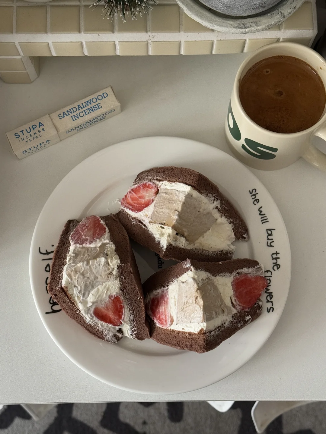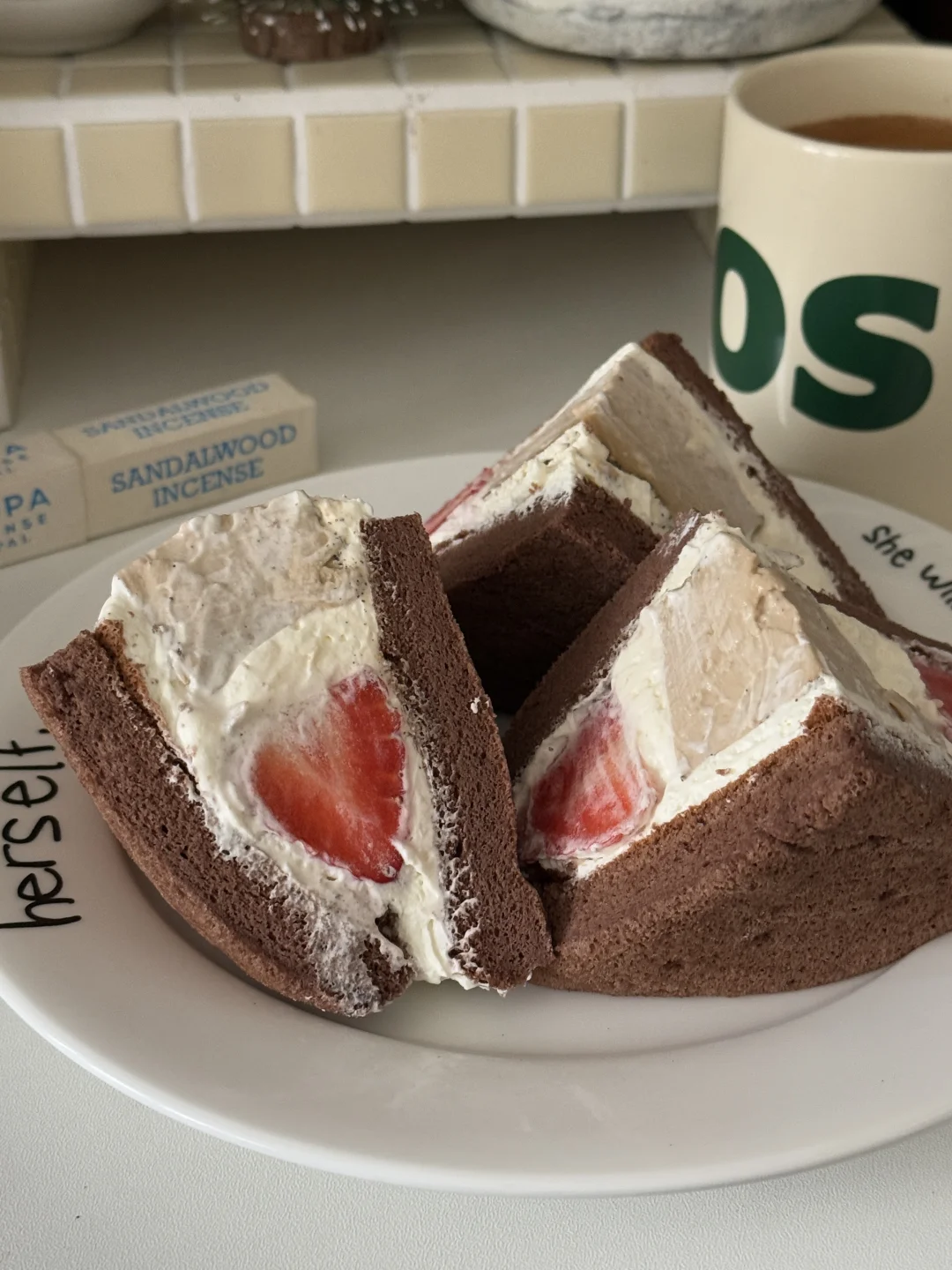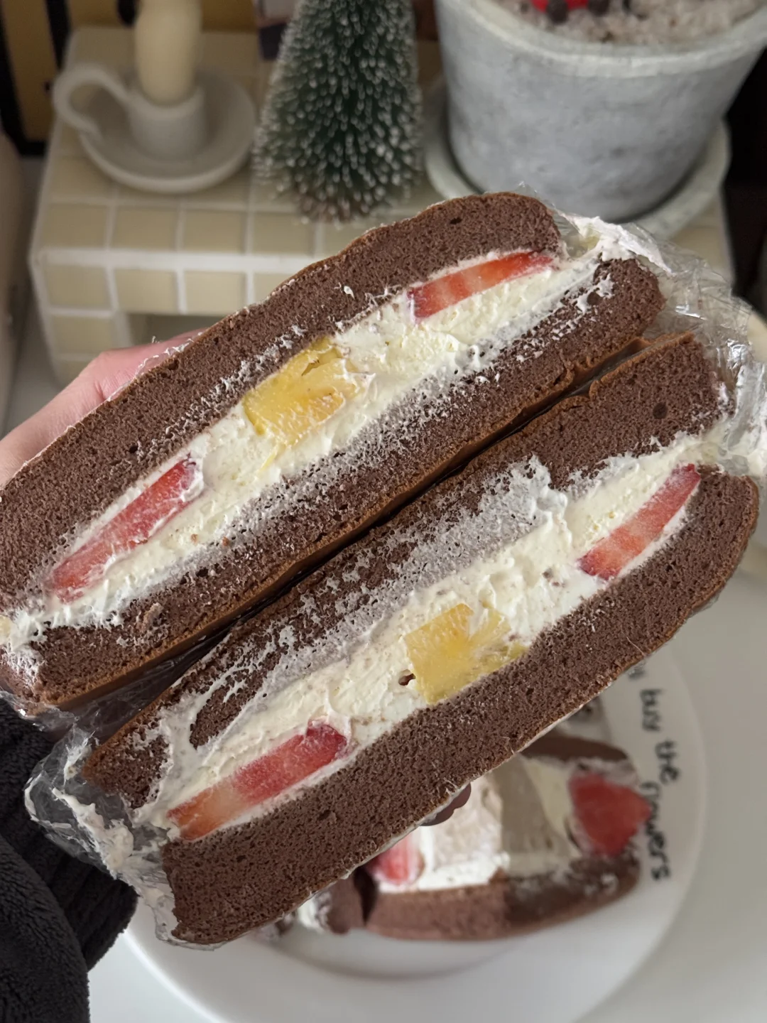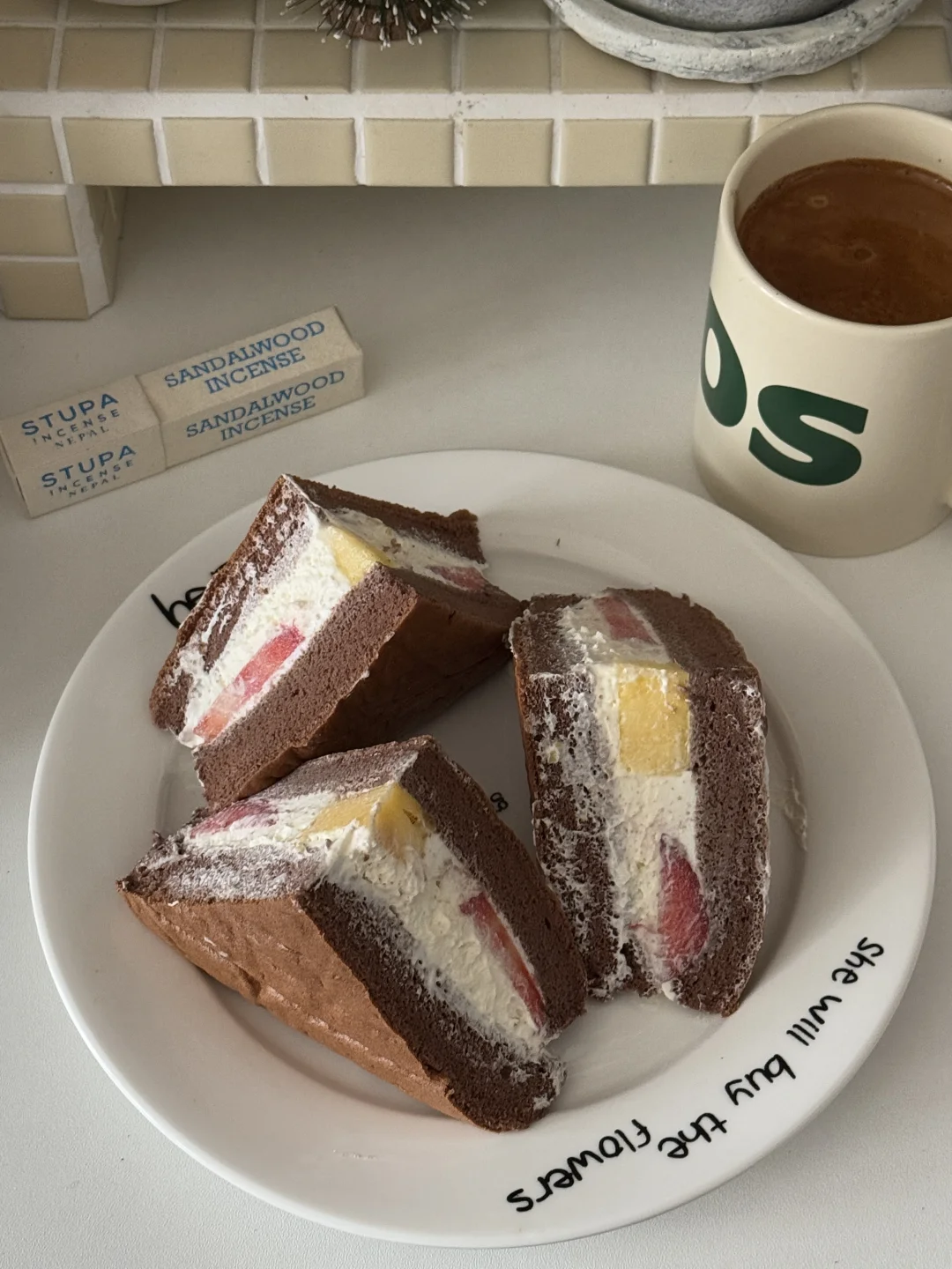 半夜不睡觉就喜欢搞一些东西 烤了一个可可味蛋糕卷🍫 打算做奶油水果三明治🥪 - 只不过太贪心了料给的满满的 切面有点混乱🤪 - 🍓草莓跟巧克力🍫还是挺适配的! 还用边角料做了一个凤梨草莓的🍍