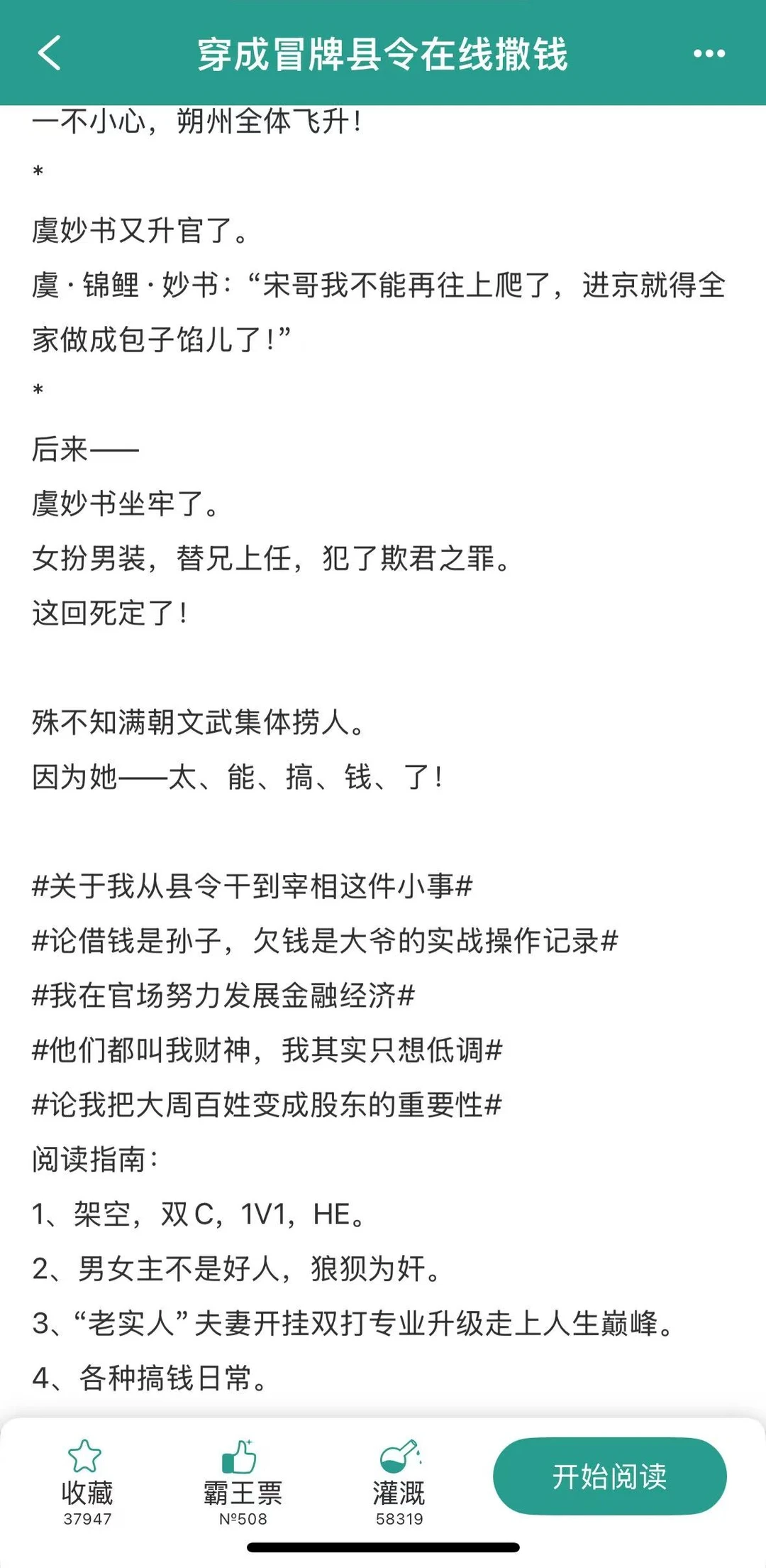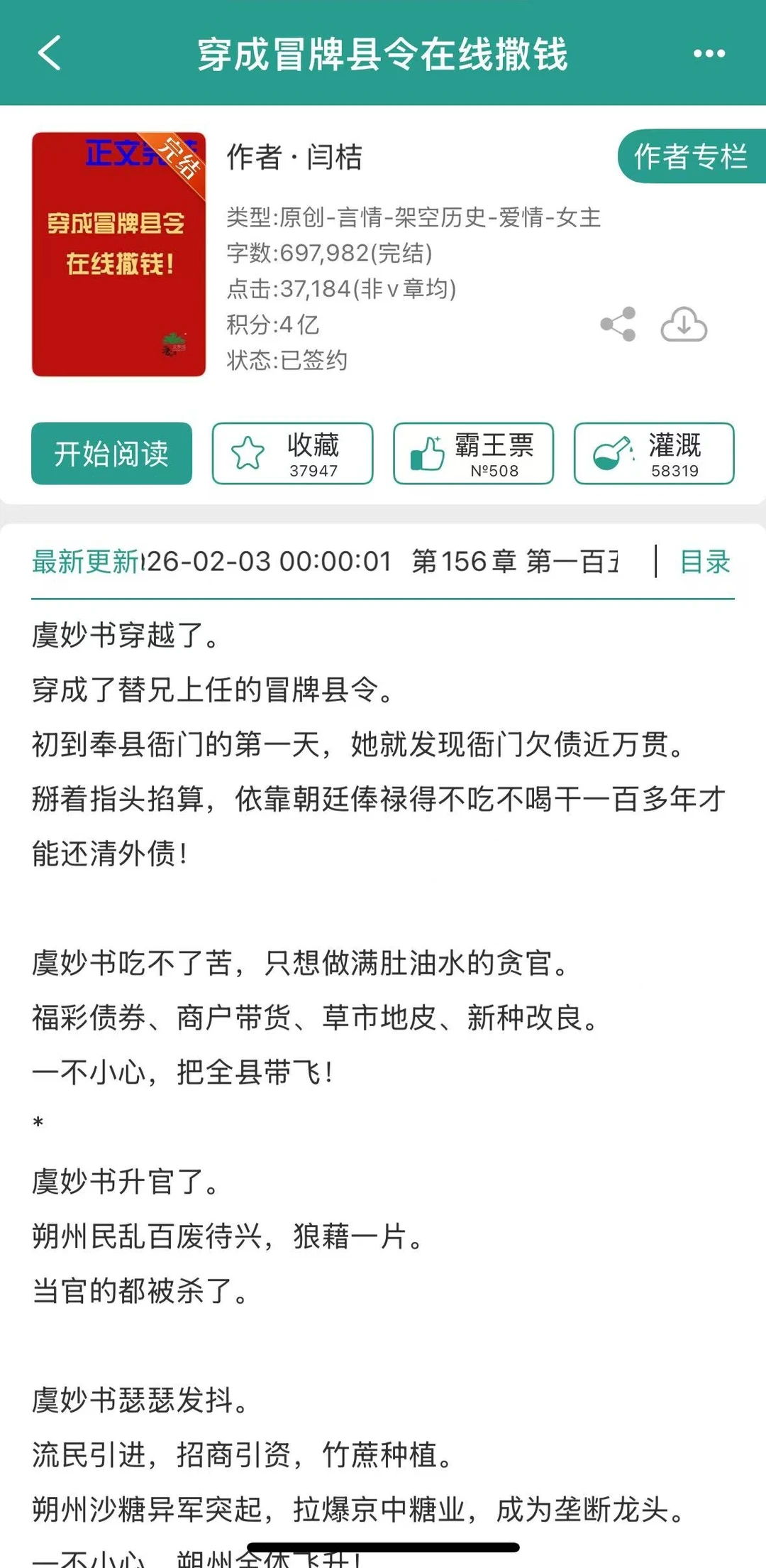 [老虎R]《穿成冒牌县令在线撒钱》by闫桔 [老虎R]腹黑聪慧 x 隐忍能干 [老虎R]古言/穿越/成长/女扮男装/基建/双强 [种草R]作者很会写这种双强+基建类型的文,读起来有一种热血气势,女主聪慧狡黠,从基层干起,一路升级打怪,成功从七品冒牌县令干到当朝宰相。男主主打一个辅助,男女主的配合绝对是最具默契的。整个故事主女主的事业线,感情线虽少但好品。