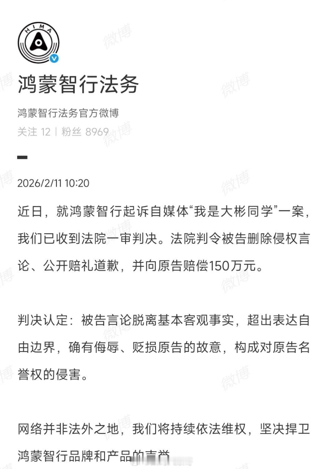 鸿蒙智行起诉自媒体一审胜诉,获赔150万元。