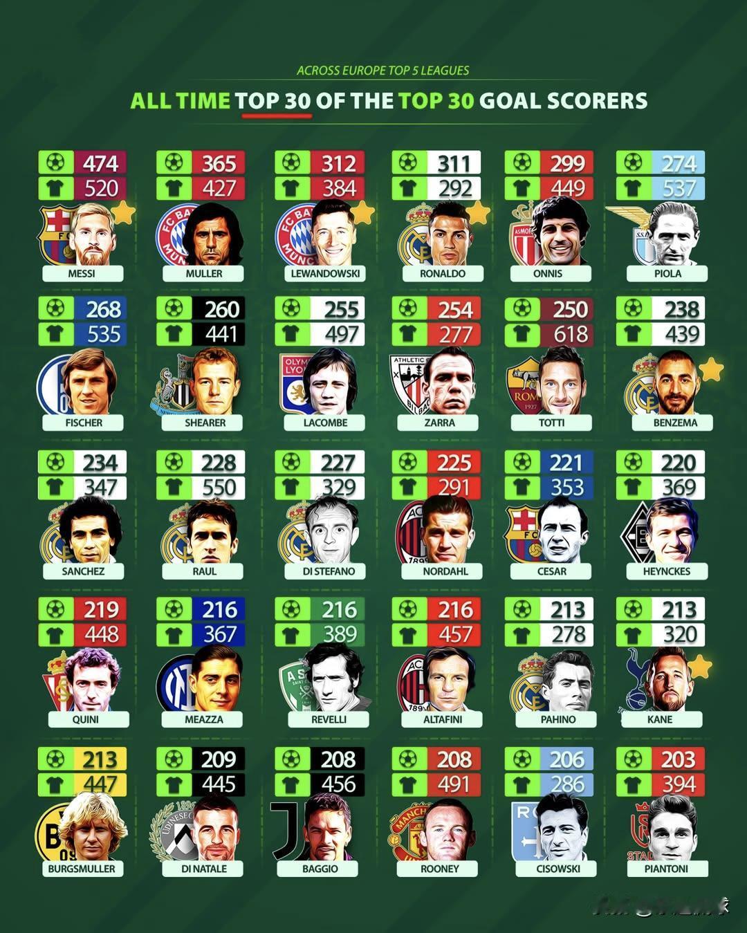 这几位都是殿堂级射手!根据欧洲五大联赛历史射手榜数据,以下是进球数位列前三十的球员。按联赛分布统计,上榜俱乐部数量最多的联赛是: 🇮🇹 意甲:6支 🇫🇷 法甲:5支 🇪🇸 西甲:4支 🇩🇪 德甲:4支 🏴 英超:3支 历史射手榜前四名球员: 1. 梅西:巴塞罗那 2. 盖德·穆勒:拜仁慕尼黑 3. 莱万多夫斯基:拜仁慕尼黑 4. C罗:皇家马德里 上榜球员最多的俱乐部前四名: 1. 皇家马德里:6人 2. 巴塞罗那:2人 3. 拜仁慕尼黑:2人 4. AC米兰:2人 (数据见证传奇,时代铭记伟大)