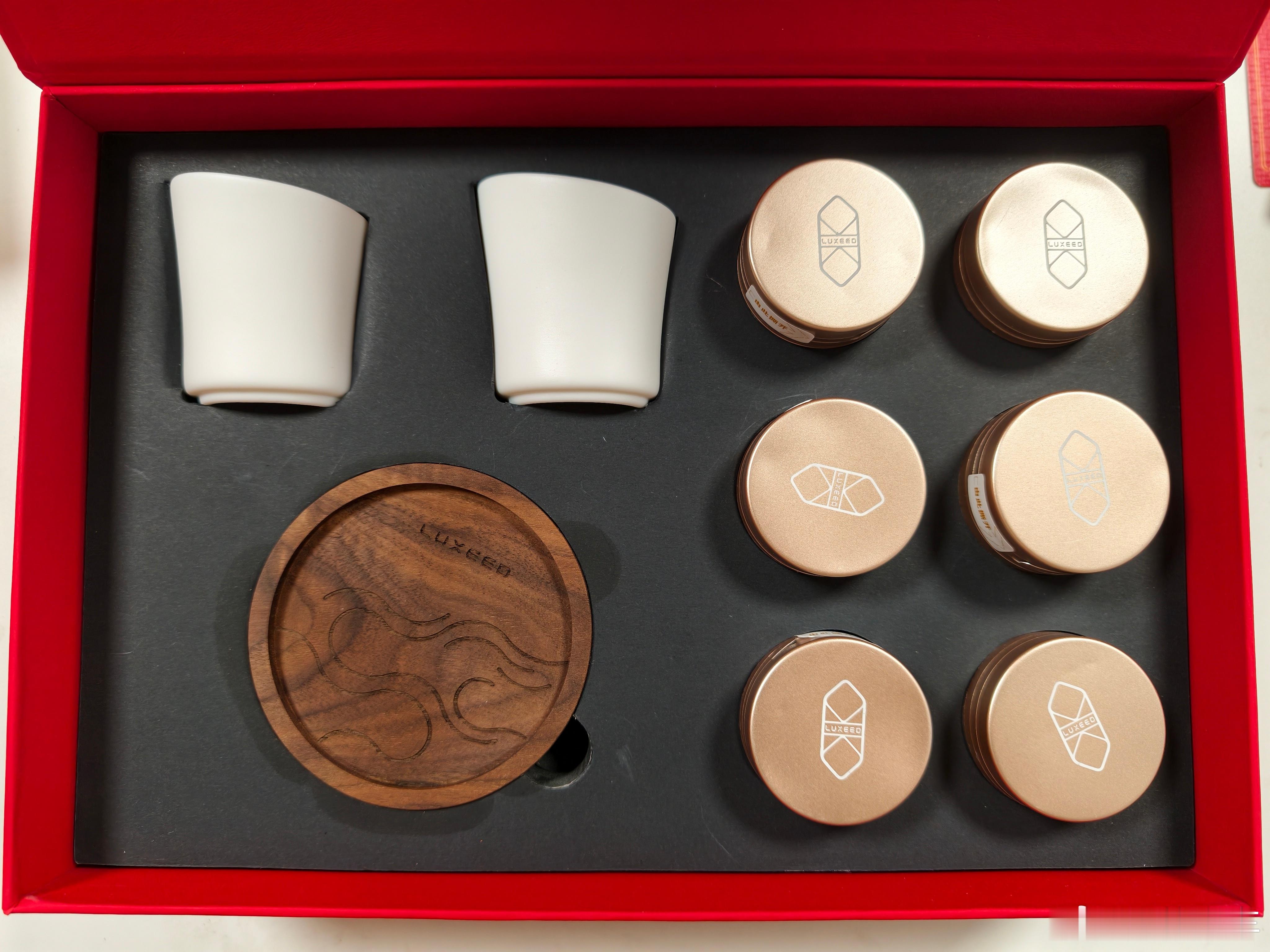 分享这套来自智界的新年茶礼,红盒子一打开就很有年味儿羊脂玉的杯子摸着润润的,黑胡桃木杯垫质感也在线,还有六罐勐海特级普洱,过年在家泡上一壶,跟家人朋友唠嗑太合适了新春礼盒