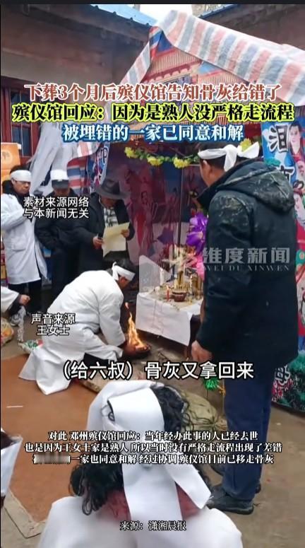 此事确实离谱,但估计还是死者无儿无女或者有其他原因的问题。河南邓州一孤寡老人在医院去世,家族中人从火葬场取回骨灰安葬3个月后,火化场突然通知拿错了,原来是另一家拿骨灰时发现找不到了。因为当年找的熟人拿骨灰而且经办人已经去世,只能找火葬场纠正。但被倒错的那一家不知道什么原因,竟然对拿回骨灰不那么在意,估计也是孤寡人员或者特殊情况。3年后才把陌生人的骨灰拿走,确实让人膈应。