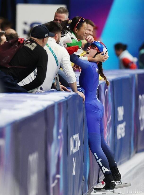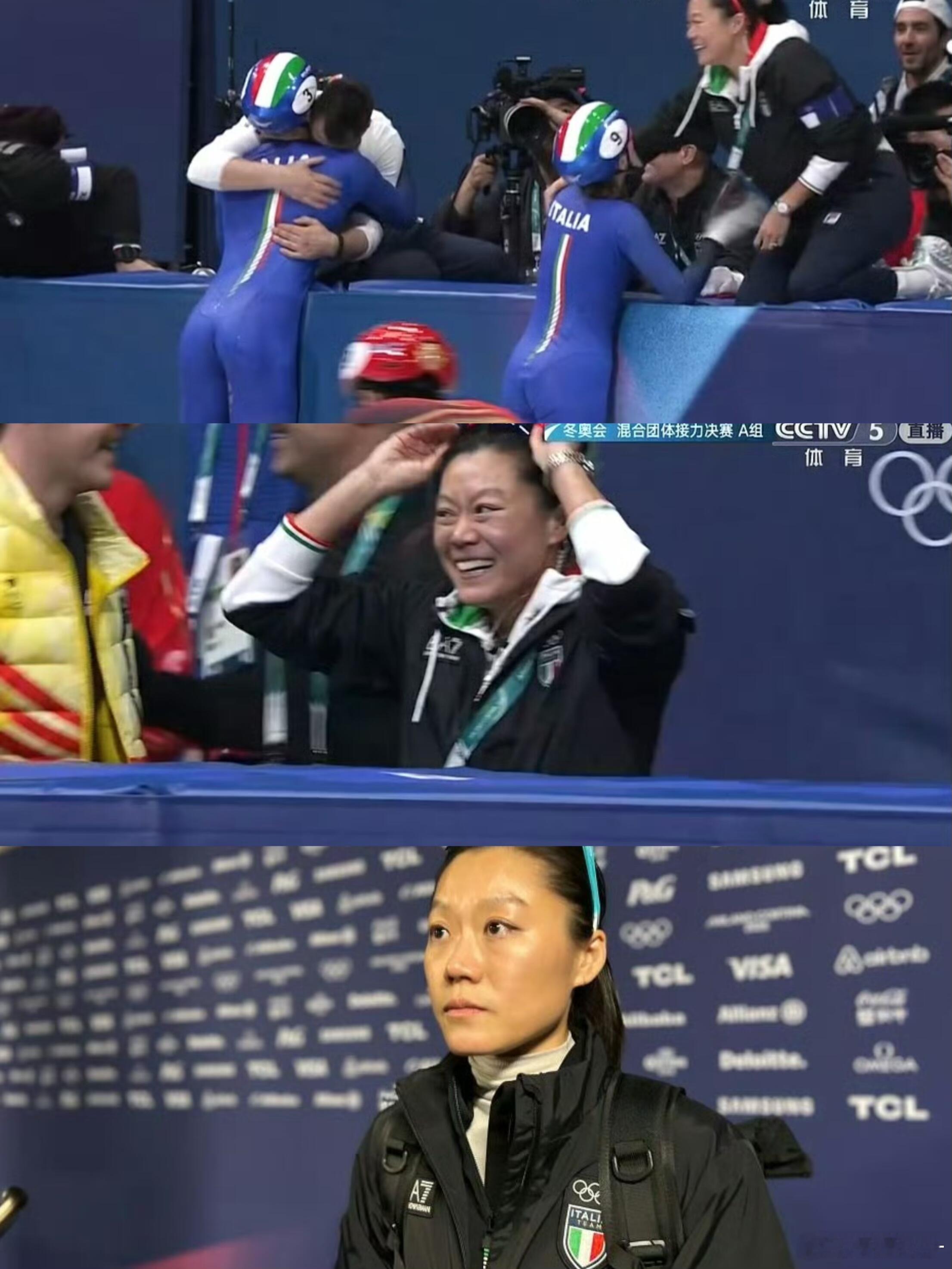 夺冠时刻,中国教练齐梦瑶在场边激动不已,与队员一一拥抱。她出生长春,曾是中国短道速滑队员,2008年因伤退役后赴加拿大学习深造,2023年正式出任意大利队主教练。