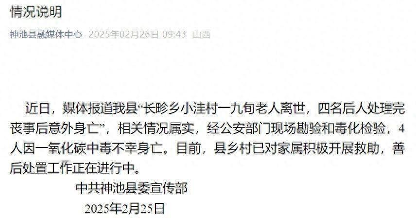 山西,一90多岁的老人去世,他在外打工的3个儿子和1个女婿赶回家办理丧事,怎料,在老人下葬的当晚,4人全部意外去世! 2025年2月,山西忻州神池县长畛乡小洼村,一场本应是“喜丧”的葬礼,却在一夜之间变成了灭门惨剧。 九旬老人寿终正寝,三个在外打工的儿子和一个女婿风尘仆仆赶回村里,操办完老人的葬礼,却在老人下葬的当晚,四人同睡一屋,再也没能醒来。 消息一出,全网哗然。有人说他们是被“鬼缠身”,有人说他们是“触了霉头”,还有人造谣说他们是搭建灵堂时从高处坠落身亡。 今天,咱们就用官方通报和科学真相,揭开这场悲剧背后的残酷现实,顺便给所有农村家庭敲响警钟。 事情发生在2025年2月24日,农历正月初六。 小洼村的李姓老人(化名),享年92岁,无疾而终。在当地习俗里,这算是“喜丧”,儿孙满堂,寿终正寝,是很多老人向往的结局。 老人的三个儿子,都在外地打工,一个在内蒙古,一个在河北,还有一个在山西本地的煤矿。女婿则在县城做装修工。 接到老人去世的消息,四人连夜往家赶。他们心里都清楚,这是最后一次为老父亲尽孝了。 葬礼办得很热闹,村里人都来帮忙。老父亲入土为安后,四个男人累得像散了架。 这几天,他们白天忙着接待亲友、布置灵堂、准备祭品,晚上还要守灵,几乎没合过眼。 老人下葬那天,天气特别冷,零下十几度。村里的房子大多是土坯房,没有暖气,取暖全靠烧炕和煤炉。 晚上,四人挤在一间屋子里休息。为了取暖,他们在屋里烧了煤炉,还烧了些秸秆增加热量。 他们以为,这只是一个普通的寒夜,睡一觉醒来,就能各自返程,继续打工赚钱。 可谁也没想到,这一觉,竟是永别。 第二天早上,邻居发现不对劲。平时早起干活的四个男人,屋里静悄悄的,没有一点动静。 敲门没人应,推门进去,眼前的景象让人心碎:四人躺在床上,身体早已冰凉,没有任何挣扎的痕迹。 报警后,公安部门迅速赶到现场。经过现场勘验和毒化检验,官方通报很快出炉:四人因一氧化碳中毒不幸身亡。 消息传开,村里炸开了锅。有老人说,这是“重丧日”的诅咒,还有人说,是老人“带走了”自己的后人。 但科学不会说谎。神池县委宣传部明确表示,事故原因是四人在密闭房间内燃烧煤炭和秸秆取暖,通风不良导致一氧化碳积聚。 一氧化碳,这个无色无味的“沉默杀手”,才是这场悲剧真正的元凶。 很多人可能不知道,一氧化碳有多可怕。 医务人员表示,一氧化碳的安全浓度在50ppm以下,当空气中一氧化碳浓度达到200ppm时,健康成年人在两到三小时内就会出现不适症状。 而当浓度达到1000ppm时,短短15分钟就能让人意识模糊,30分钟内就可能导致死亡。 更可怕的是,一氧化碳中毒时,人会感到头晕、恶心、乏力,然后逐渐失去意识,根本没有力气去开门窗求救。 这四个男人,就是在睡梦中,不知不觉被夺走了生命。 这场悲剧,暴露了中国农村取暖安全的残酷现实。 国家疾控中心数据显示,每年冬季农村一氧化碳中毒死亡率是城市的3倍多。在华北地区,仍有68%的农村家庭使用传统炕炉取暖,而这些家庭中,配备一氧化碳报警器的不足10%。 小洼村的这户人家,正是这68%中的一员。他们可能不知道,睡前要开窗通风;他们可能不知道,煤炉要安装烟囱;他们更可能不知道,一氧化碳中毒有多快、多致命。 而乡镇卫生院的急救条件也令人担忧。神池县的乡镇卫生院,连高压氧舱这种一氧化碳中毒的必备急救设备都没有,就算发现及时,也很难挽救生命。 这不是个例。在很多偏远农村,安全宣传仍依赖“大喇叭广播”,年轻人大多外出打工,家里留下的老人和孩子,对安全知识更是知之甚少。 悲剧发生后,当地政府迅速行动,对逝者家属进行了救助,同时在全县范围内开展了农村取暖安全专项检查。 但再多的救助,也换不回四条鲜活的生命。这四个男人,都是家里的顶梁柱,他们的离世,让四个家庭瞬间崩塌。 老人的老伴,一夜之间失去了所有儿子和女婿;他们的妻子,失去了丈夫;他们的孩子,失去了父亲。 这场悲剧,给所有农村家庭敲响了警钟: 1. 冬季取暖,一定要保持室内通风,哪怕只是开一条小缝。 2. 煤炉、炕炉必须安装烟囱,并且定期检查是否堵塞。 3. 条件允许的话,一定要安装一氧化碳报警器,这几十块钱的东西,可能就是保命符。 4. 一旦出现头晕、恶心等症状,立即开窗通风,转移到空气新鲜的地方。 同时,也希望有关部门能加大农村安全取暖的宣传力度,改善农村的急救条件,让这样的悲剧不再重演。 愿每一个家庭都能平平安安,愿每一个在外打工的人,都能安全回家。  信息来源: 山西一九旬老人离世,3个儿子及女婿处理丧事后意外身亡,官方通报:因一氧化碳中毒 2025-02-26 10:16·红星新闻