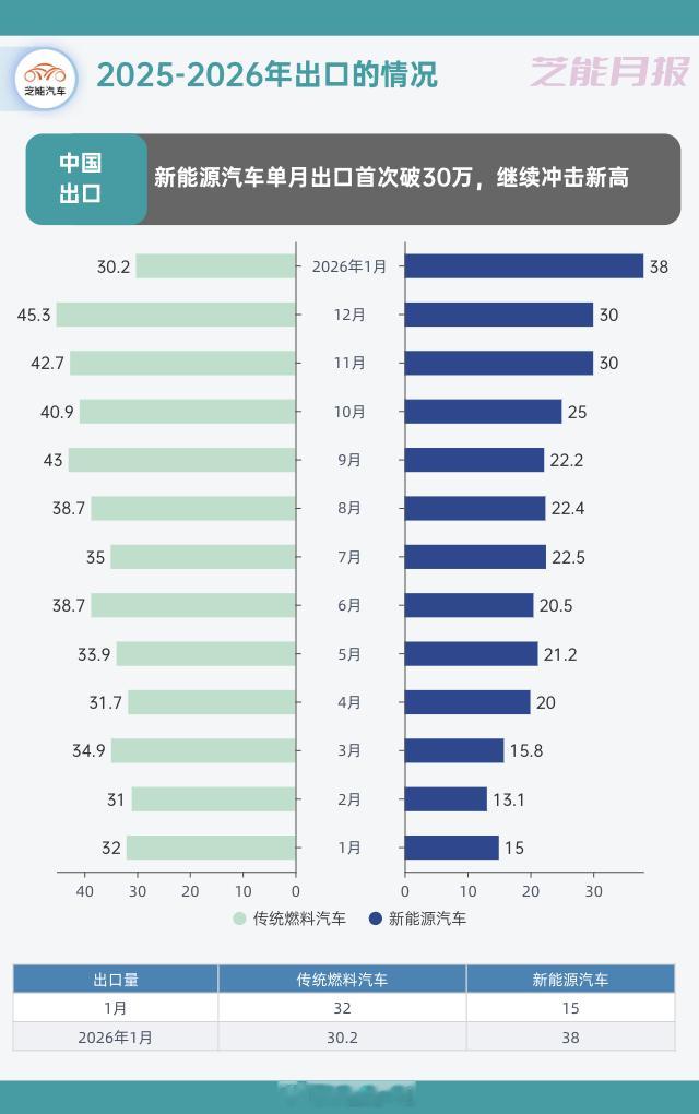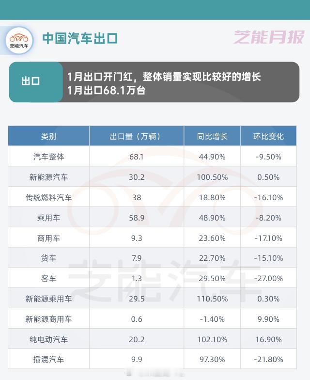 1月新能源出口 30.2 万辆,同比 +100.5%,占整体出口比重接近 45%。◎ 传统燃料汽车出口38万辆,同比增长18.8%。