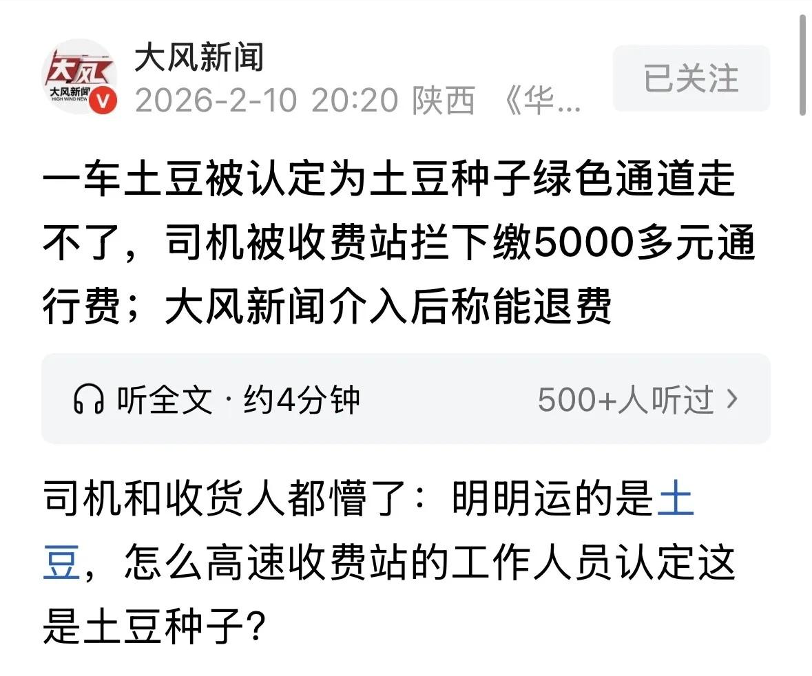 35吨土豆被收费站拦下:“你这是种子,交5711!”司机当场懵了…… 跑长途运输的杨昆师傅,干这行已经五六年了,专门往外地送土豆。这活听着简单,其实全是辛苦钱,尤其是每年丰收季,没日没夜在高速上跑,赚的就是个运费差价,能省下的过路费就是纯利润。 今年2月6号,杨师傅在平台上接了个单子,从呼伦贝尔牙克石市的种植基地装货,目的地是陕西商洛。货是33到35吨袋装土豆,订单上清清楚楚写着“土豆”,还特意备注了“绿通、到卸”。 装车的时候,杨师傅特意看了一眼货。袋子里装的都是沾着新鲜泥土的土豆,大小均匀,品质不错,装在粉白相间的编织袋里。袋子粉色那面印着“优质马铃薯 荷兰十五”,还有净含量25公斤、黑龙江种植基地等字样。 杨师傅心里踏实了——这就是最普通的食用土豆,超市里卖的那种。他拉了这么多年,从来没出过岔子。 2月8号晚上,车开到了商洛南城子收费站。眼看就要卸货结运费了,杨师傅松了口气。可就在下高速的时候,意外发生了。 收费员过来检查货物,打开车厢看了一眼编织袋,脸色就不太对了。他指着袋子上的“荷兰十五”几个字,语气肯定地说:“师傅,你这拉的是土豆种子,不是食用土豆,不能享受绿通免费政策,得正常交费。” 杨师傅一听,脑子“嗡”的一声,简直不敢相信自己的耳朵。 他赶紧解释:“同志,您搞错了!这哪是什么种子?这就是吃的土豆!您看看这土豆,沾着泥呢,大小均匀,就是市场上卖的那种。收货方是批发商,这货是要进超市的,我这儿有订单,您看看!” 他把手机里的订单详情调出来,递给收费员看。可收费员摆摆手,态度很坚决:“包装上印了品种名,那就是种子。我们有规定,种子不属于绿通范围。” 杨师傅急得直冒汗,这笔费用可不是小数目。这一趟运费本来就不高,如果还要交5711元的过路费,这趟活不仅白干,自己还得倒贴钱进去。 就在双方僵持不下的时候,高速交警也被叫来了。交警了解情况后,对杨师傅说:“师傅,你先别堵着通道,把费用交了,有什么问题再慢慢理论。” 这句话让杨师傅心凉了半截。他知道,今天这钱不交是走不了了。为了不耽误送货,也怕把事情闹大影响以后的活,他咬了咬牙,掏出信用卡,刷了5711元。 交了钱,杨师傅以为能顺利卸货了。可更让他窝火的事还在后头。 因为收费站这一折腾,耽误了卸货时间,收货方那边不乐意了。批发商老板打来电话,语气很不好:“杨师傅,我这批货是定好的精品土豆,今天晚上必须进超市!你这耽误了时间,损失算谁的?” 杨师傅满肚子委屈没处说,只能连连道歉。更让他憋屈的是,他从收货方那里得知,就在2月10日早上——也就是他被收费的第二天——另一辆车拉着一模一样的货,从“商洛西”收费站下高速,人家就顺顺利利走了绿通,一分钱没交! 这个消息像是一记重锤,砸在了杨师傅心上。 一样的土豆,一样的包装,甚至可能是同一个种植基地出来的,为什么在隔壁收费站就能免费通过,在这里就成了“种子”?这理儿上哪儿说去? 杨师傅越想越气,越想越觉得窝囊。他决定,这事不能就这么算了! 从2月8号晚上开始,杨师傅就把货车停在收费站广场不走了。他说:“这钱交得不明不白,我等个说法。” 于是,这位40多岁的中年汉子,就在驾驶室里熬了两天两夜。饿了吃口泡面,困了在座椅上眯一会儿。陕西2月的夜晚,气温很低,驾驶室里冷得像冰窖,但杨师傅心里憋着一团火。 这期间,他联系了媒体记者求助。面对镜头,这个跑运输多年的汉子声音有些哽咽:“我家里还有老婆孩子要养,这5000多块钱对我来说不是小数目。更憋屈的是这理没处说!我运的就是土豆,怎么就成了种子?” 事情终于在2月10号下午迎来了转机。记者联系了陕西交通部门的监控中心,反映了这个情况。 神奇的是,就在记者打完电话后不久,涉事收费站的工作人员主动找到了还在车里等待的杨师傅,态度明显变了。他们承认是自己工作失误,这车货应该走绿通,那5711元钱可以退给他。 听到能退钱,杨师傅心里的石头总算落了地。但他还是高兴不起来——这两天的油钱、耽误的时间、跟收货方闹的不愉快,还有自己受的这一肚子气,找谁赔去? 截至发稿前,虽然收费站口头承诺退费,但具体流程还没走完。杨师傅还在等着最后的确认,他说:“跑我们这行的,就怕这种不清不楚的规定。要是早说清楚,我也不至于在这儿冻两天。希望以后各地标准能统一点,别让我们司机夹在中间受气。” 对于这件事,您怎么看?您在运输途中遇到过类似的“糟心事”吗?欢迎在评论区分享您的经历和看法。 (本文根据陕西当地媒体“大风新闻”等报道撰写)