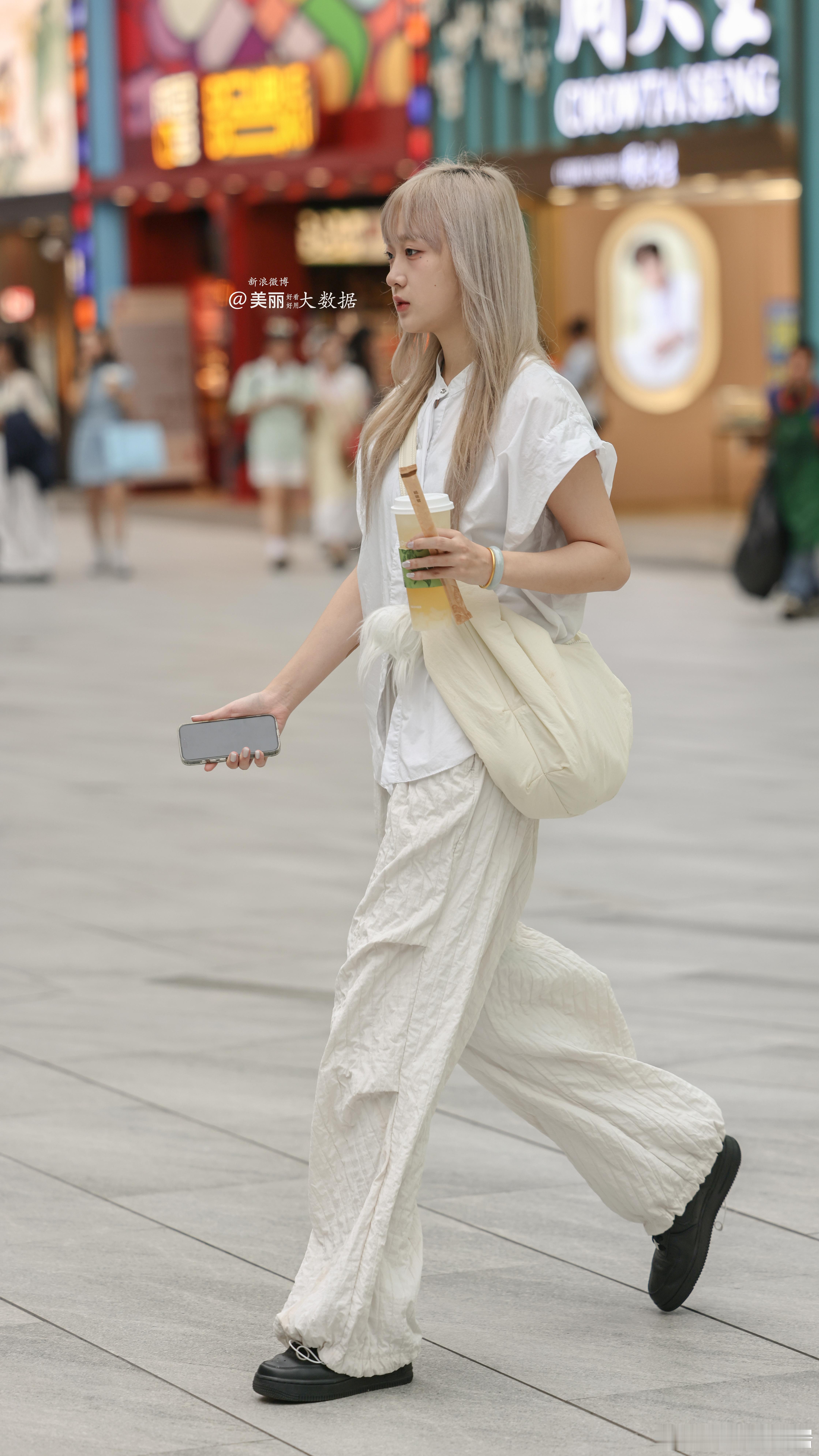 优雅白裤装,粉色包包点缀,都市时尚风!