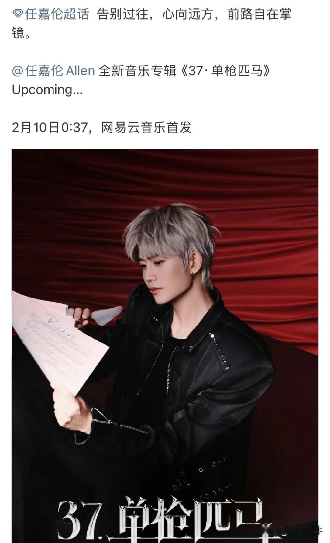 你可真行啊! 保密工作做到很彻底, 嘉人们一点消息都没有, 你就直接放出来了一个重磅消息! 任嘉伦第四张专辑 37.单枪匹马2月10日, 新年惊喜,即可到达!@任嘉伦