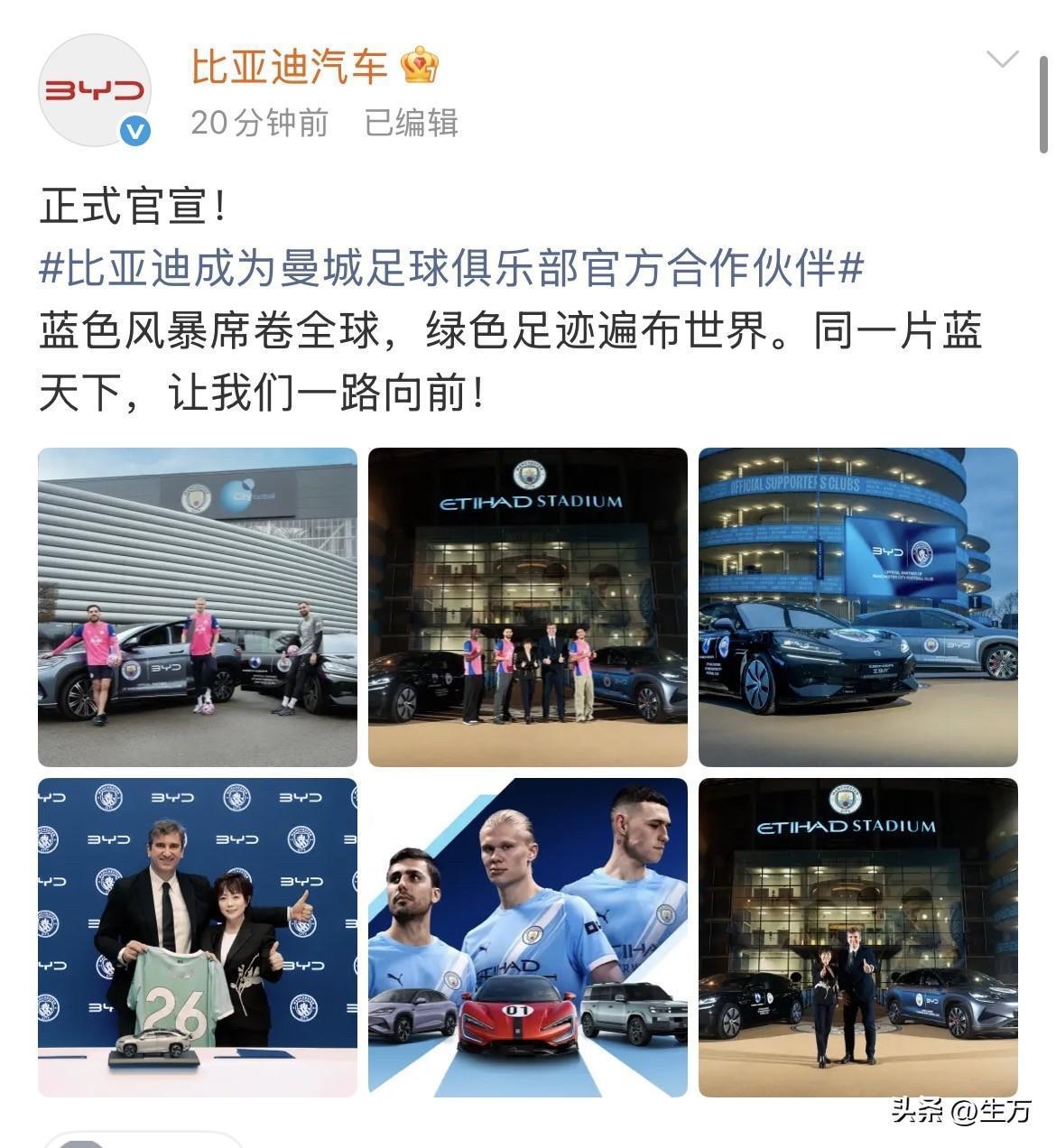 比亚迪官宣了:成为曼城足球俱乐部官方合作伙伴! 就在刚才,比亚迪官方是个账号放出了一组图片,他们与曼城足球俱乐部,达成了官方合作! 这一系列的海报当中,比较吸引眼球的就是曼城的当家球星哈兰德,他穿着一件粉色的球衣,左脚踩着足球,左手插兜,右手靠在一台比亚迪车身旁边,轻轻地拉开一点车门,亮出比亚迪的商标! 同时俱乐部的管理层,还与比亚迪的各个车型进行了系列的合影,而且还专门弄了一个26号的比亚迪官方的球衣! 这也是意味着,比亚迪开始与传统的足球豪门俱乐部开始合作了,可不要小看了这种合作,对于开拓全球市场来说,这种合作的战略意义是很具有前瞻性的。 尤其是对于欧洲市场来说,当那些球迷知道比亚迪是曼城的合作伙伴之后,他们去选择比啊,你这个品牌的可能性就会更大了,其实比亚迪这个汽车品牌在欧洲的知名度,与特斯拉不相上下,现在更多的是拼一些比较细分的市场。