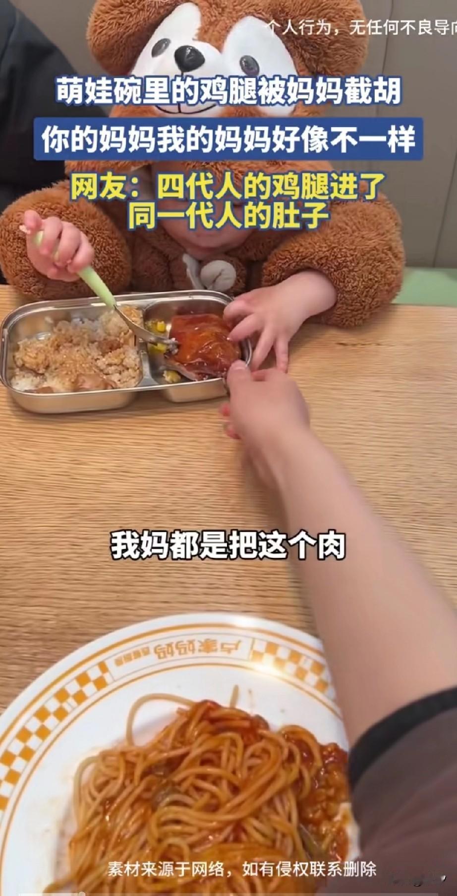 现在的宝妈带娃可不一样,不会惯着她吃饭,宝娃不好好吃饭! 妈妈直接将他的鸡腿半路截胡,宝宝很不愿意,用手阻止,结果没有妈妈力气大! 盘子中的鸡腿就被夺走了,不是说好的妈妈疼娃吗?可这代母子却不一样,娃不好好吃饭,直接就把他的饭给吃了! 你的妈妈,我的妈妈好像不一样,网友表示四代人的鸡腿都被一代人给吃了! 大家觉得这样的宝妈带娃是不是有一手? 带娃 宝妈带娃现状 带娃现状 带娃带成这样 职场带娃妈妈
