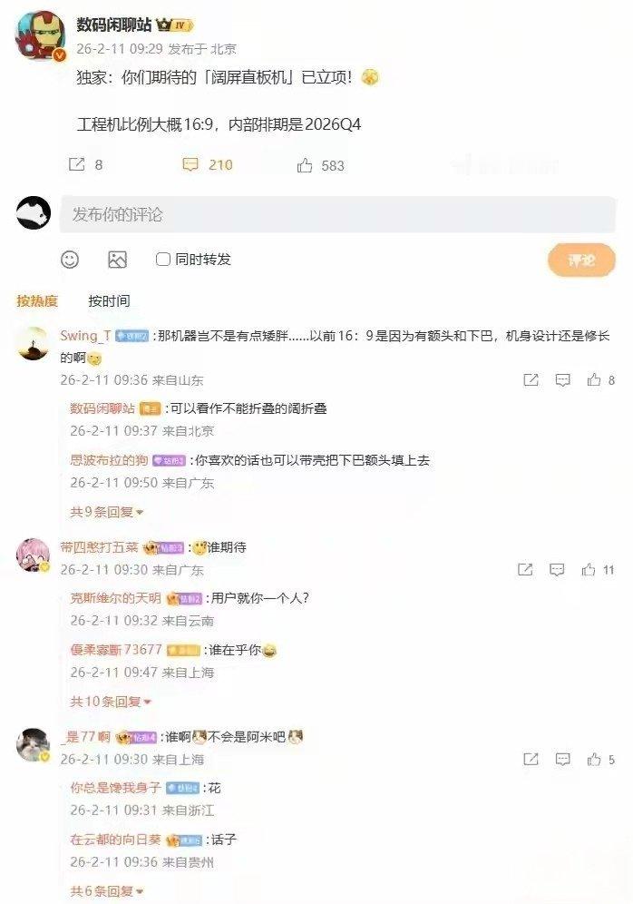 博主 数码闲聊站发文透露,大家期待的「阔屏直板机」已立项,工程机比例大概 16:9,内部排期是 2026 年 Q4。结合评论区讨论来看,该机预计归属华为品牌。
